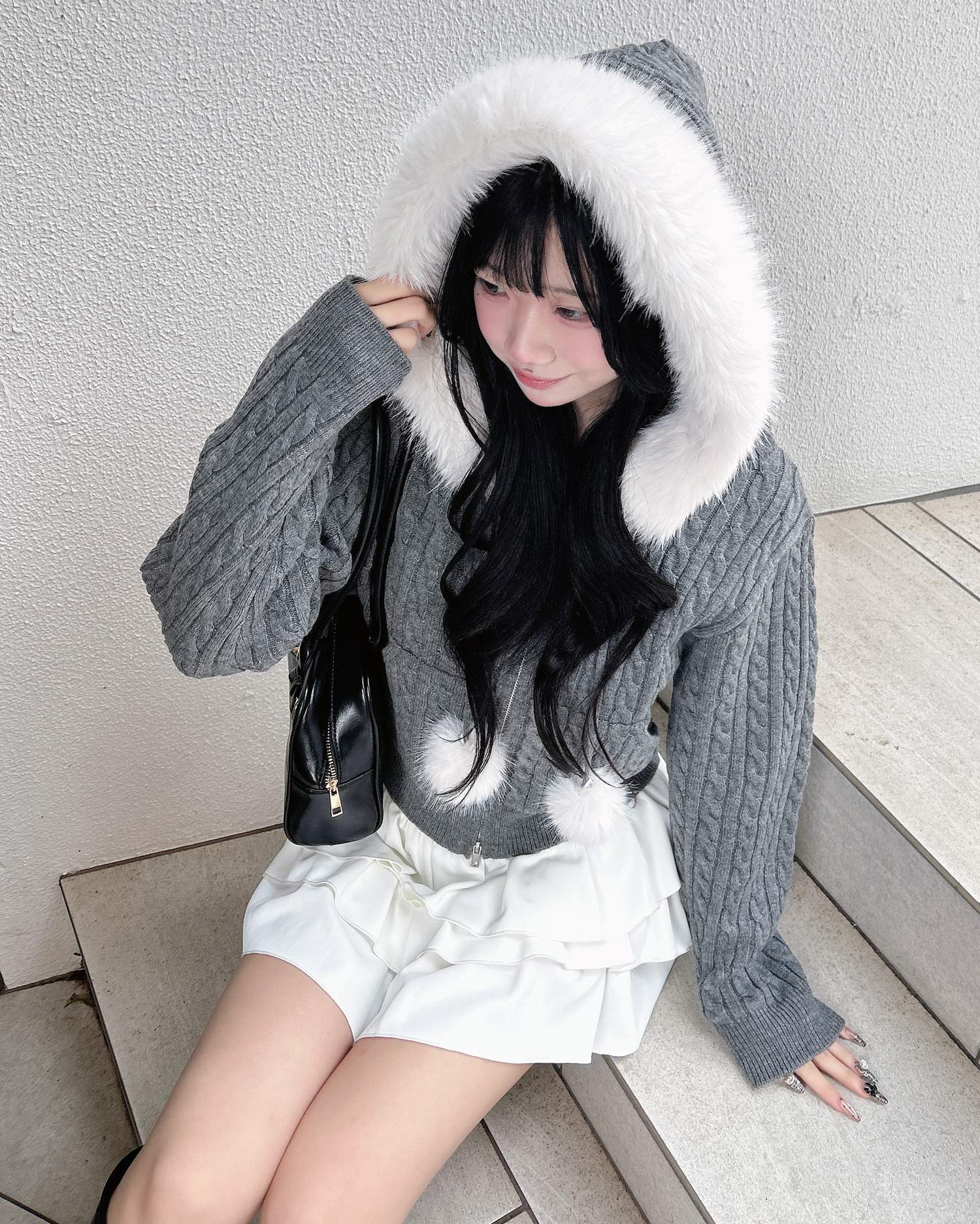 1254-600299 ポンポン付フェイクファーケーブルニットパーカー