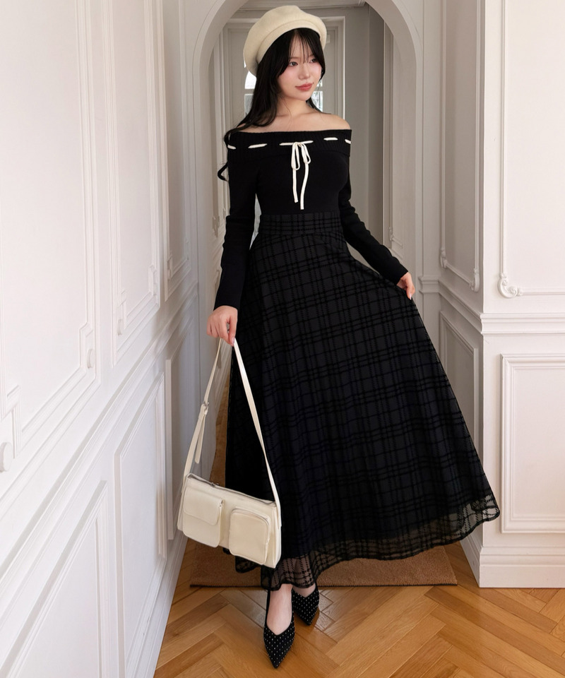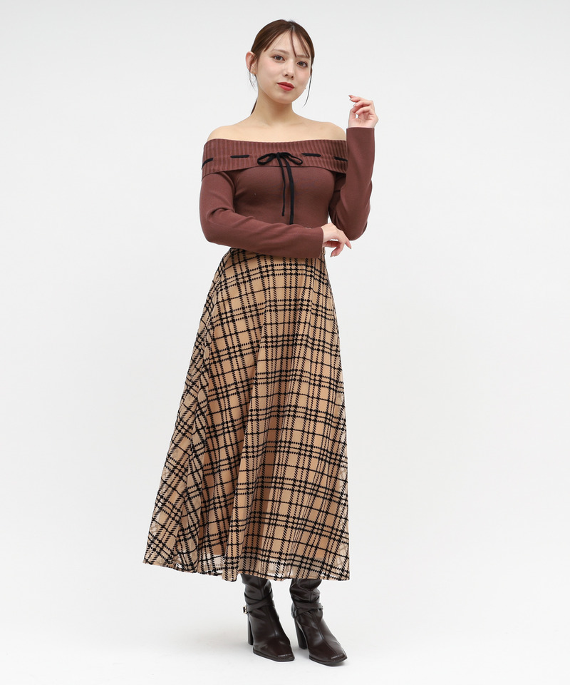 配色リボンがアクセントのオフショルニット×存在感溢れるフロッキーチェックが魅力のスカートがドッキングされた1着。