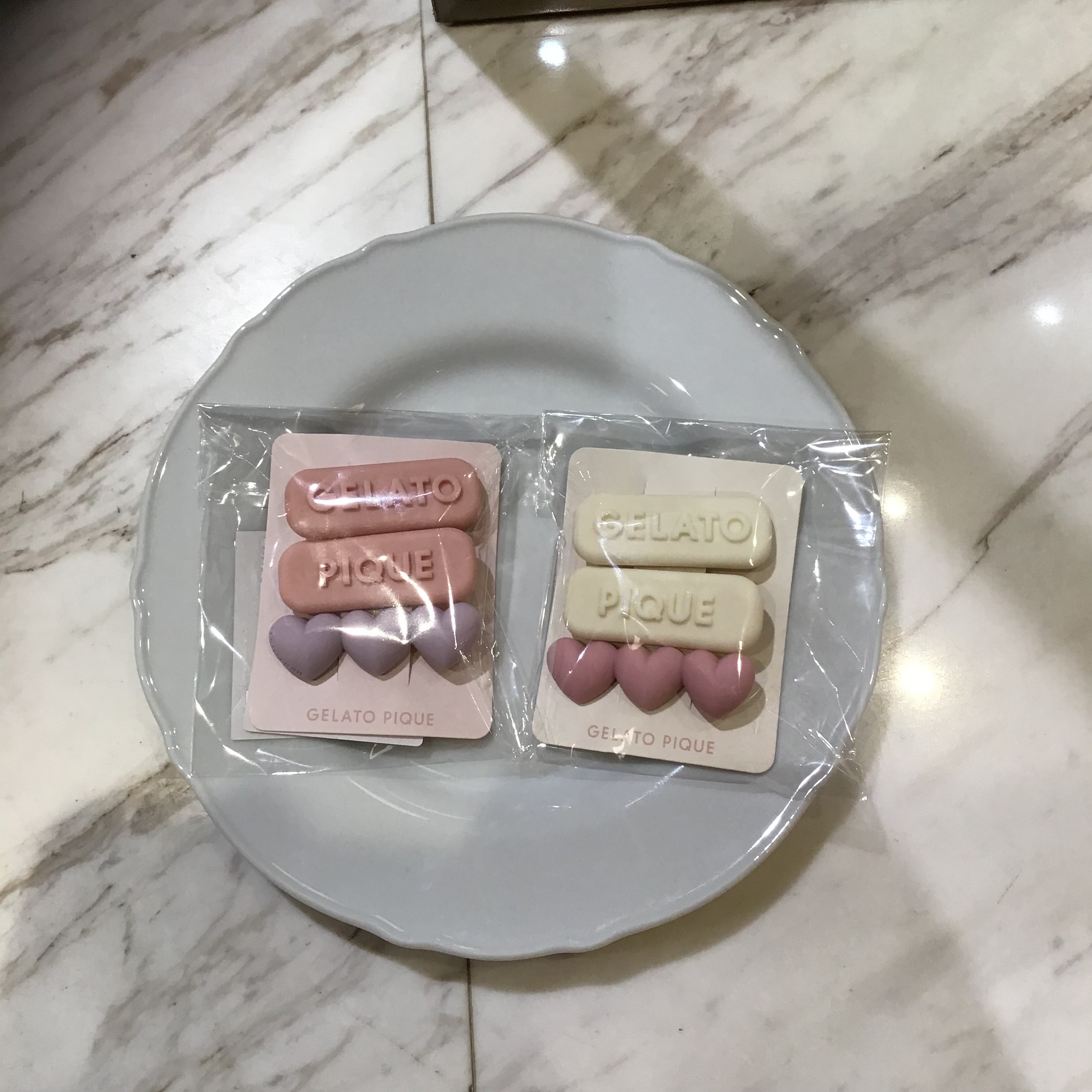 ぷっくりした3連のハートモチーフと、「GELATO」と「PIQUE」のロゴをデザインしたヘアクリップ3本セット☁️2つのロゴをセットで付けるとブランドロゴが完成する、キャッチーなアイテムです。色はアイボリーとピンクの2色をご用意しました💞💞
