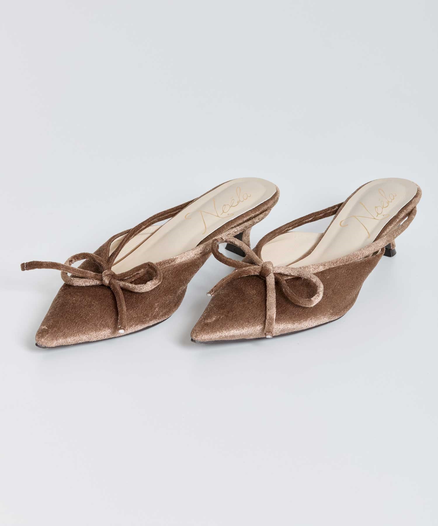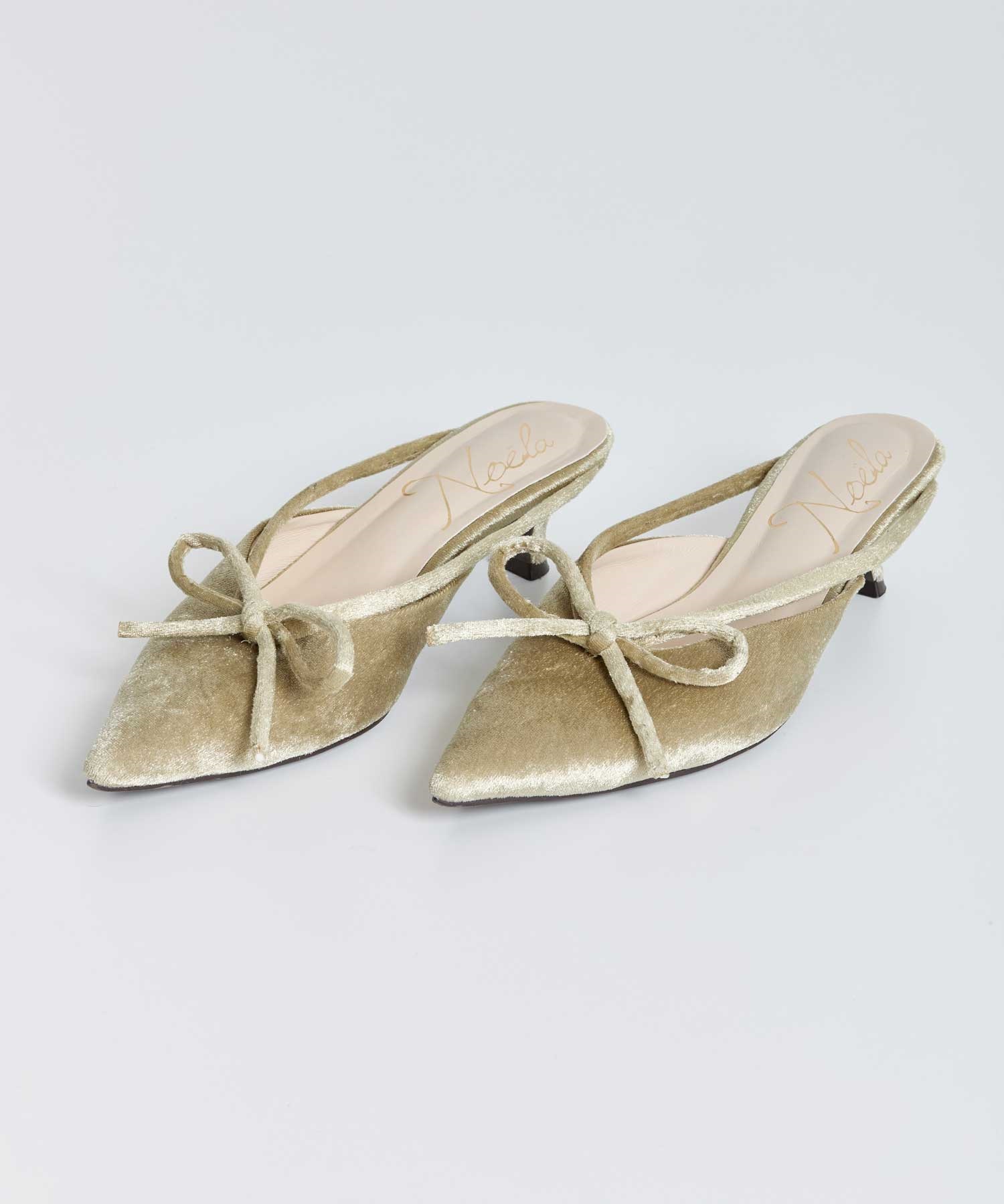上品な光沢のあるベロア素材と甲のリボンモチーフがポイントの低めヒールのミュール。 さっと履ける気軽さと、きちんと感のあるシルエットのバランスが絶妙です。