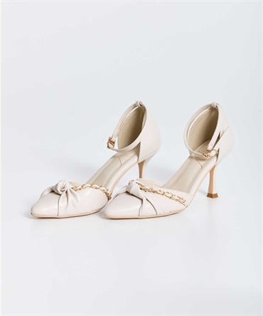 つま先には、リボンのように結ばれたノットモチーフ。その結び目に通されたチェーンディテールが、クラシックさと少しのモード感を添えます。