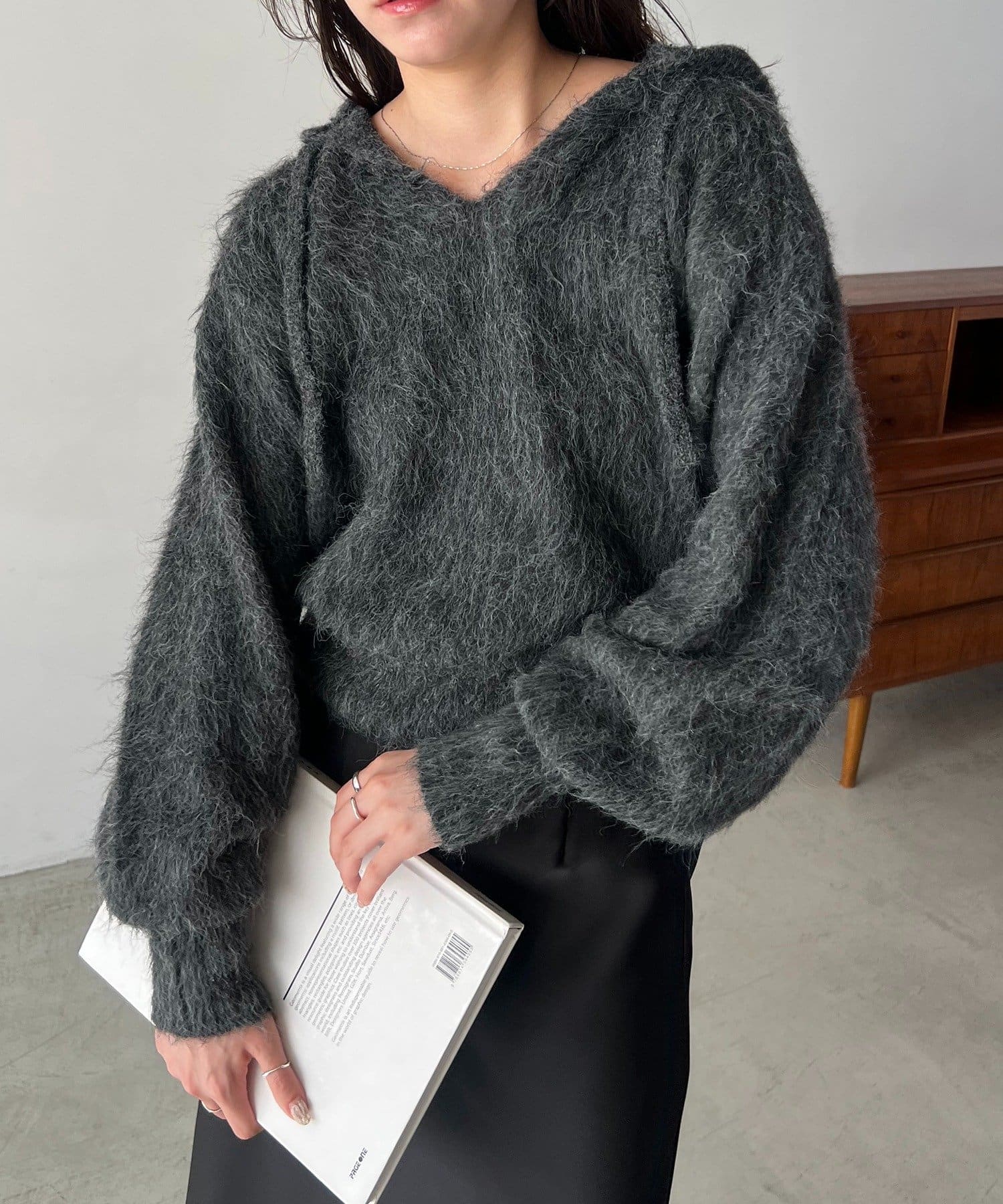 シャギーニットにフードが付いているデザインは珍しく被りにくいので個性を出したい方におすすめ✔️