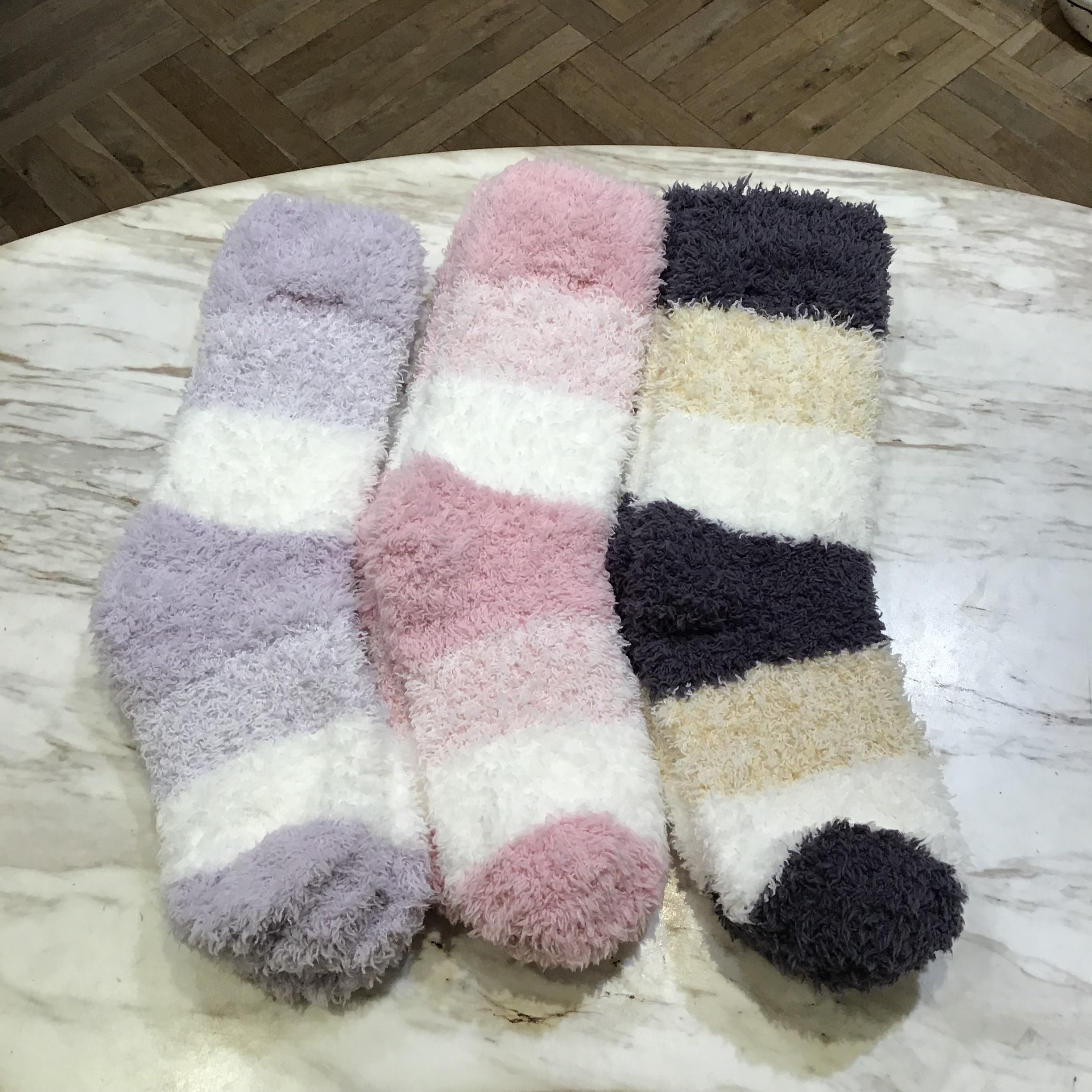 ふっくらした着用感で足元を包むルームソックスは、ワンポイントの刺繍入り✨3色ボーダーのうち1色がメランジカラーになっているのがポイントで、ピンクとラベンダーはグラデーション調のカラーリング、ネイビーはメリハリのある配色デザインで仕上げました🎶