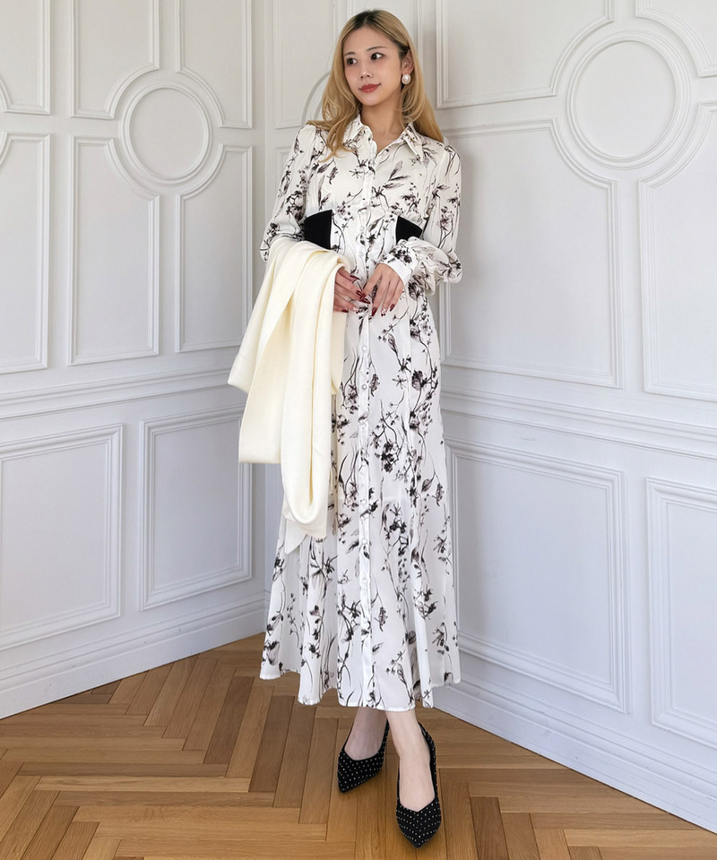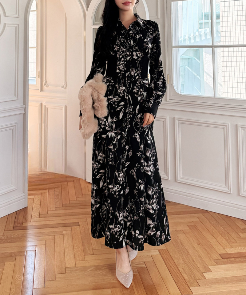 シンプルながらもひと目で大人の女性らしさが際立つ、花柄×シャツ襟の上品デザインが魅力のマーメイドワンピース。