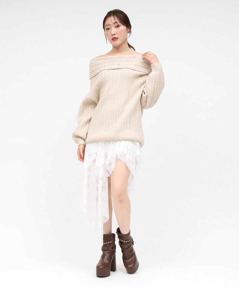上品に散りばめられたパールが顔周りを華やかに魅せてくれるオフショルニットチュニック。