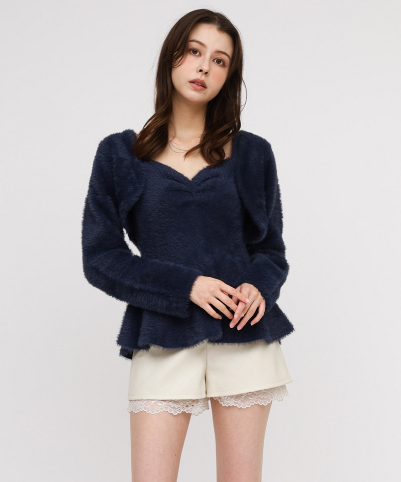 ミニシャギー素材の柔らかな肌触りが魅力の短丈カーディガン&ペプラムノースリーブトップスのセットは、ふわっと軽くて着心地も抜群。