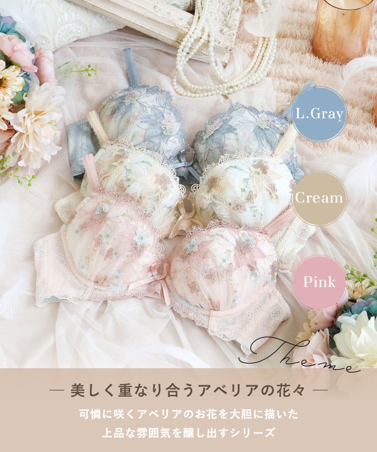 可憐に咲くアベリアのお花をイメージしたシリーズです。レースにはラフなステッチで大胆に描いたアベリアと小花を刺繍して、その上からお揃いのチュールアップリケをあしらうことで、奥行きのある繊細な仕上がりに。さらにツイード風の網目模様をほどこした小花のアップリケを重ねて、キラキラと輝くラメ糸とワンポイントのカラーリングが、お花がふわっと浮き出ている様子を可愛らしく表現しています。カップ上辺には幾何学模様を立体的なインケミ手法でほどこして、エレガントな美しさを演出。色展開も冬の空気に溶け込むような、やわらかく上品な雰囲気を醸し出すコレクションです。