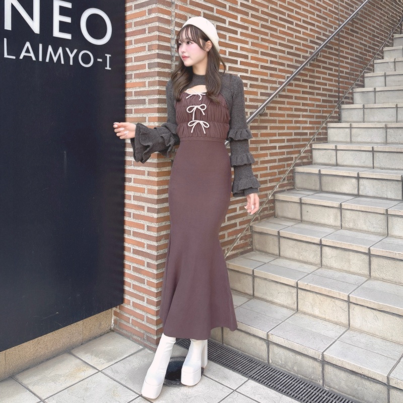 女性らしいマーメイドワンピースに、フリル袖がドラマチックなボレロニットを組み合わせた特別なアンサンブル♡✨