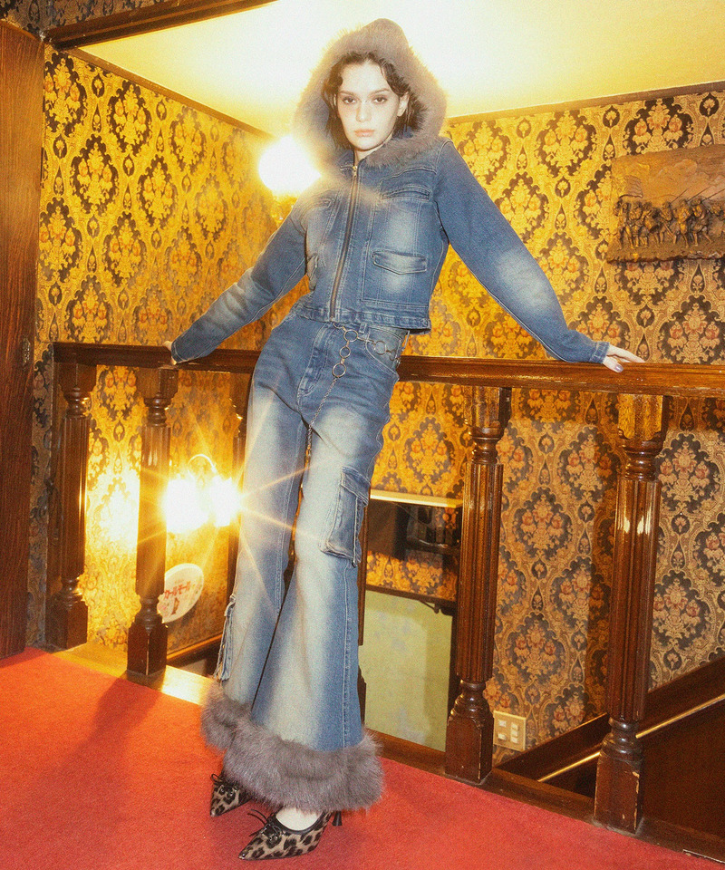 ファーフードが顔周りを華やかに彩るデニムジャケット。