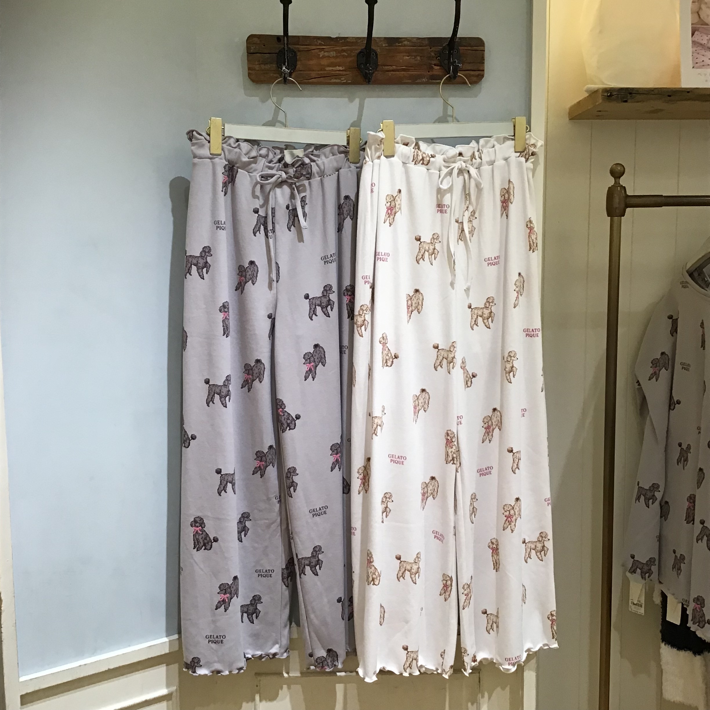 首元に大きなリボンを付けたプードル柄がポイントのロングパンツ🐶ウエストにフリルをあしらったロングパンツは、裾にメローを入れてフェミニンな表情を演出✨ワイドなゆったりシルエットで、カジュアルながらも女性らしさをお楽しみいただけるアイテムです🎀