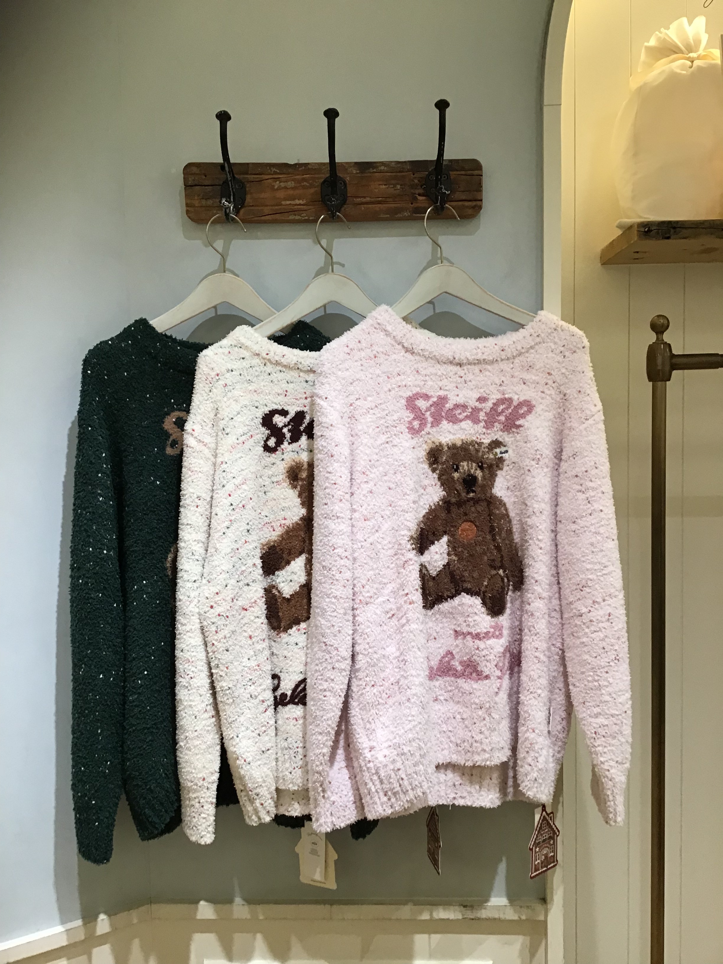 カラーネップ入りの’パウダー’素材のジャガードプルオーバーです🧸☁️1902年にSteiffが生み出した世界で最初のテディベア『55PB』をフロントに描いています💞粉砂糖のようなパウダリータッチと、ゆったりとした着心地に包まれます。色はクリーム、ピンク、グリーンの3色展開。同シリーズのアラン柄ロングパンツと組み合わせたり、メンズサイズとのペアコーディネートもお楽しみいただけます🎶