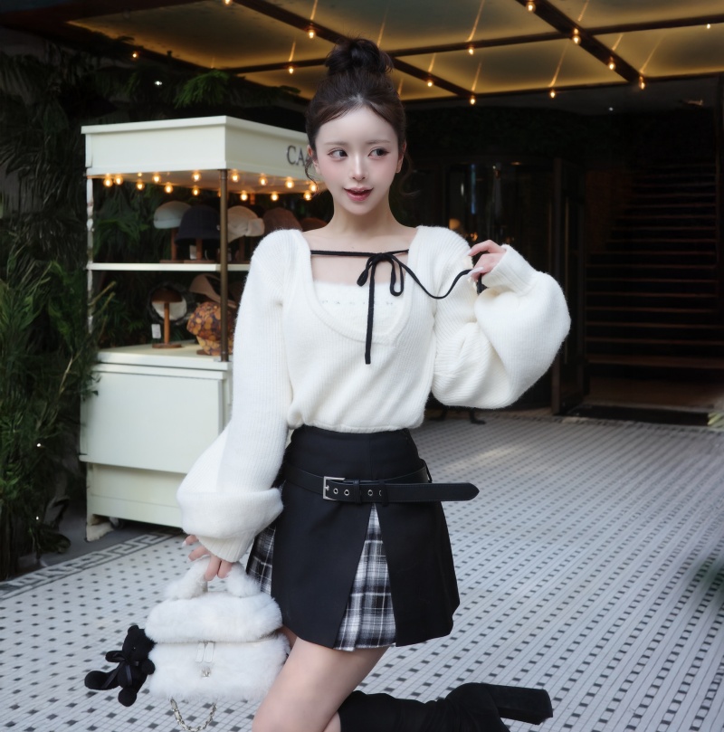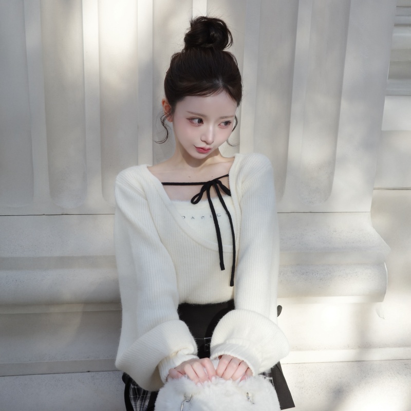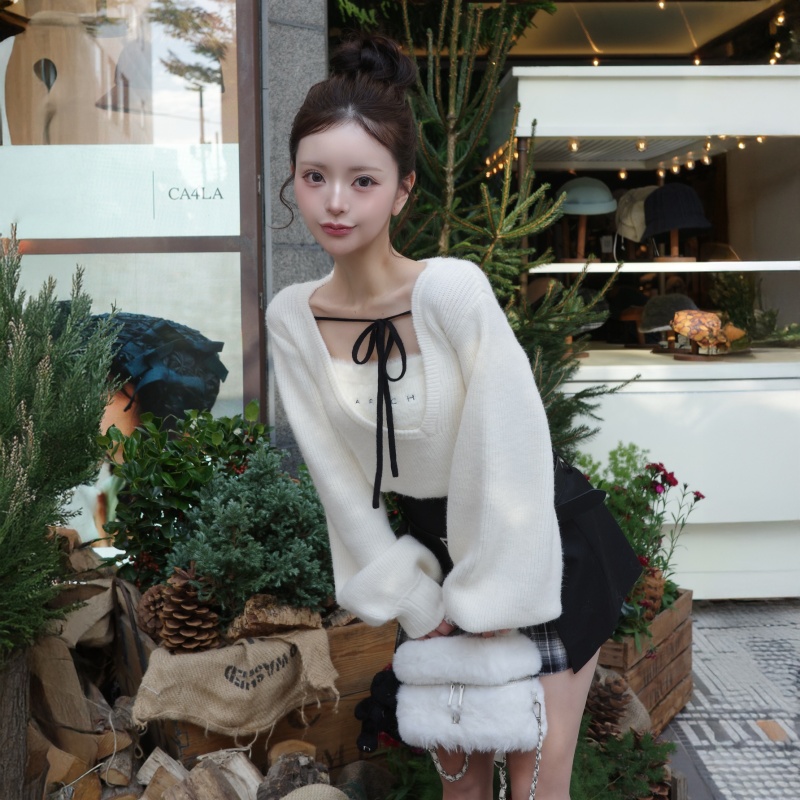 ふわふわシャギーのベアトップ×配色リボンのニットを重ねた、甘めムードたっぷりのレイヤードトップス🎀✨