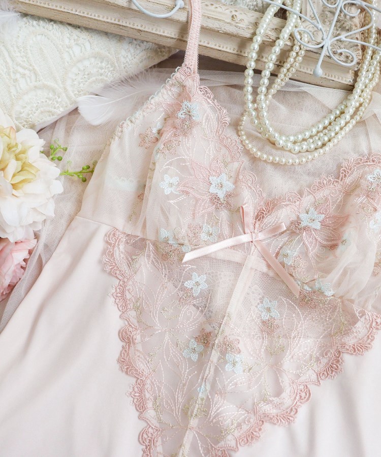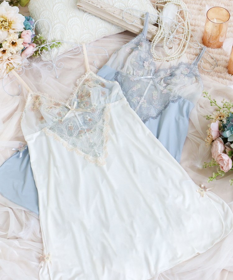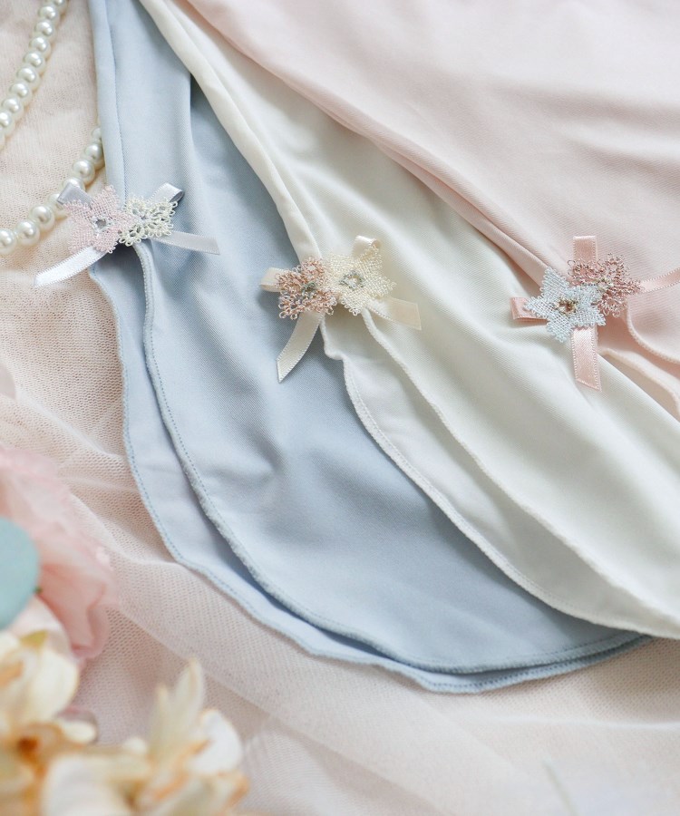 可憐に咲くアベリアのお花をイメージしたシリーズです。レースにはラフなステッチで大胆に描いたアベリアと小花を刺繍して、その上からお揃いのチュールアップリケをあしらうことで、奥行きのある繊細な仕上がりに。さらにツイード風の網目模様をほどこした小花のアップリケを重ねて、キラキラと輝くラメ糸とワンポイントのカラーリングが、お花がふわっと浮き出ている様子を可愛らしく表現しています。カップ上辺には幾何学模様を立体的なインケミ手法でほどこして、エレガントな美しさに。前身頃にはお揃いの刺繍レースを、バックスタイルにはストレッチレースをふんだんにあしらい、360度どこから見てもこだわりを詰め込んだ豪華なスタイルが完成しました。両サイドにはスリットとアップリケを添えて、動くたびにひらひらと揺れる裾が女性らしさを演出します。色展開も冬の空気に溶け込むような、やわらかく上品な雰囲気を醸し出すコレクションです。