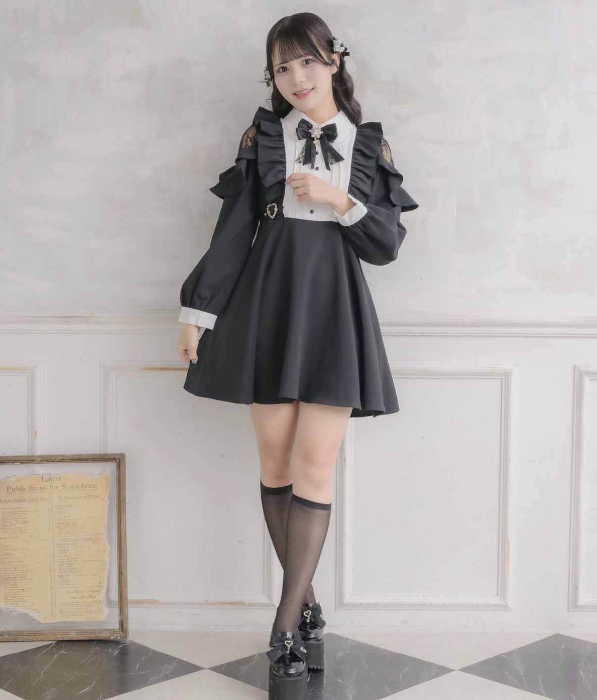 メイドライクなヨーク切り替えを取り入れたドーリーワンピース。地雷っぽくフリルディテールでほどよい甘さをプラス♡サイドにはハートバックルのベルトをあしらい、ウエストをキュッとマークしてスタイルアップ効果も◎可愛らしさの中にちょっぴりスパイスを効かせた、主役級の一着です。