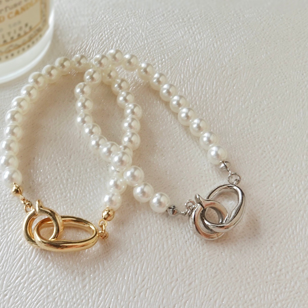 手元を上品に彩る、煌めきを放つパールブレスレット🤍 立体感のあるノット金具が高級感を引き立てるデザインです💫 enjoueelは関西唯一の店舗です♪ 是非お立ち寄りくださいませ♡