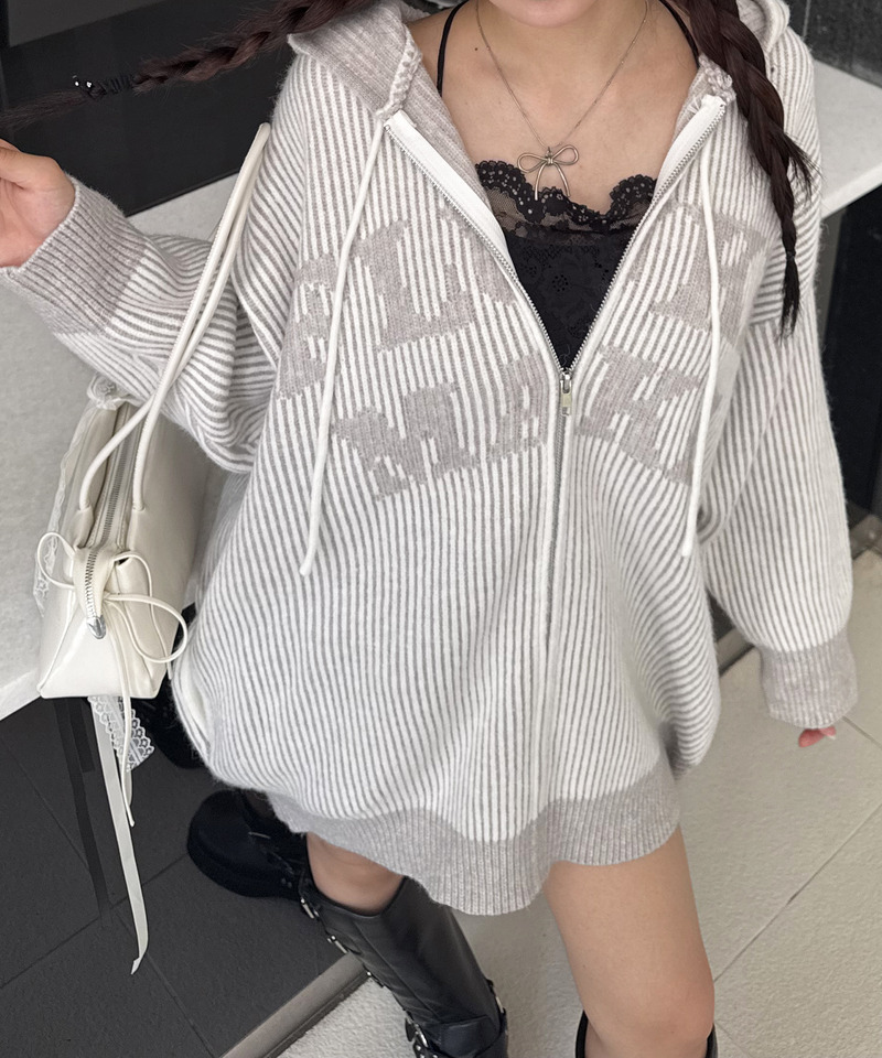 配色のように見える奥行きある編み地と、ロゴジャガードが印象的なZIPパーカー。 ニット素材ならではの柔らかさと、フード付きのラフなシルエットで、デイリーに活躍。 羽織るだけでスタイリングに程よい抜け感をプラスします。 オーバーシルエットなのでワンピースのように一枚での着用もおすすめです。