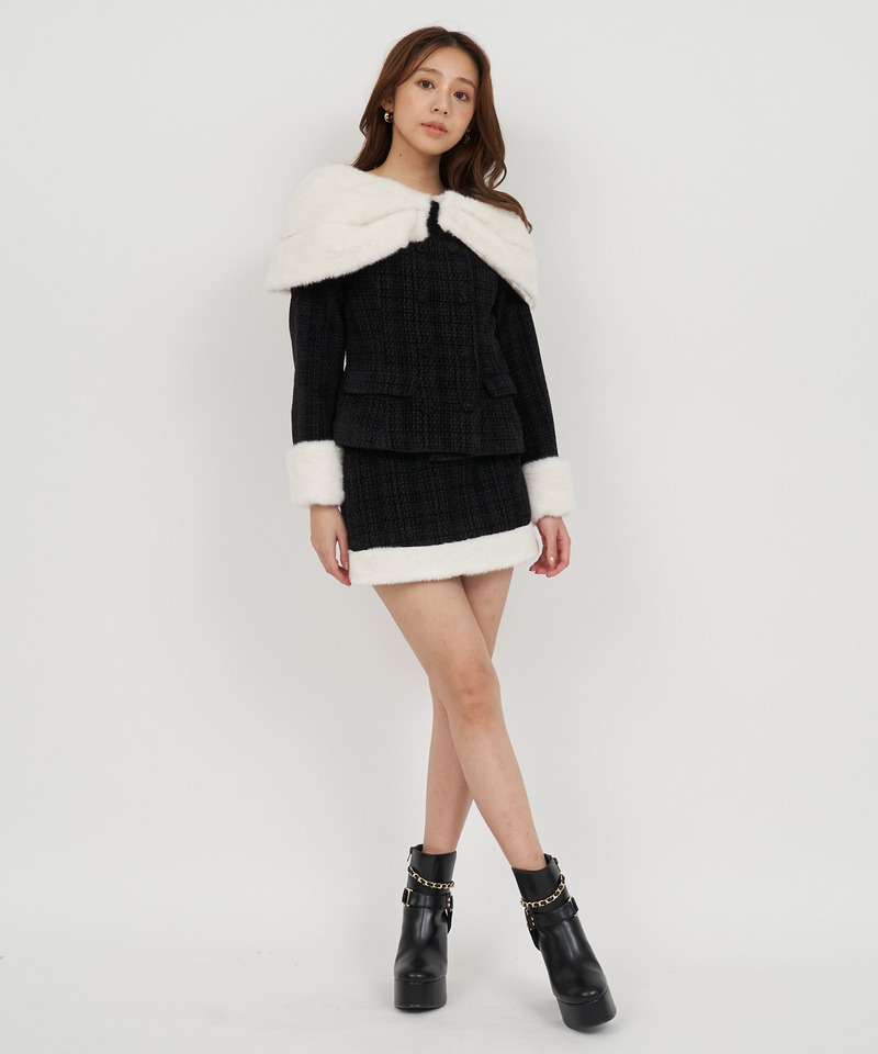 クラシカルなツイード素材に、ふわりとしたファーを裾にあしらったミニスカート。