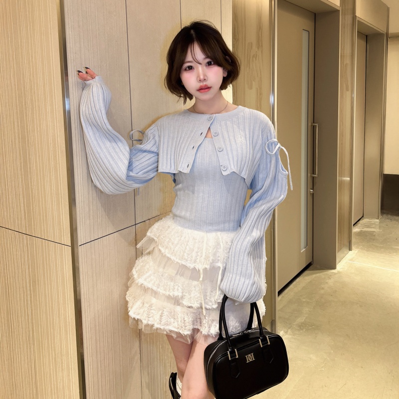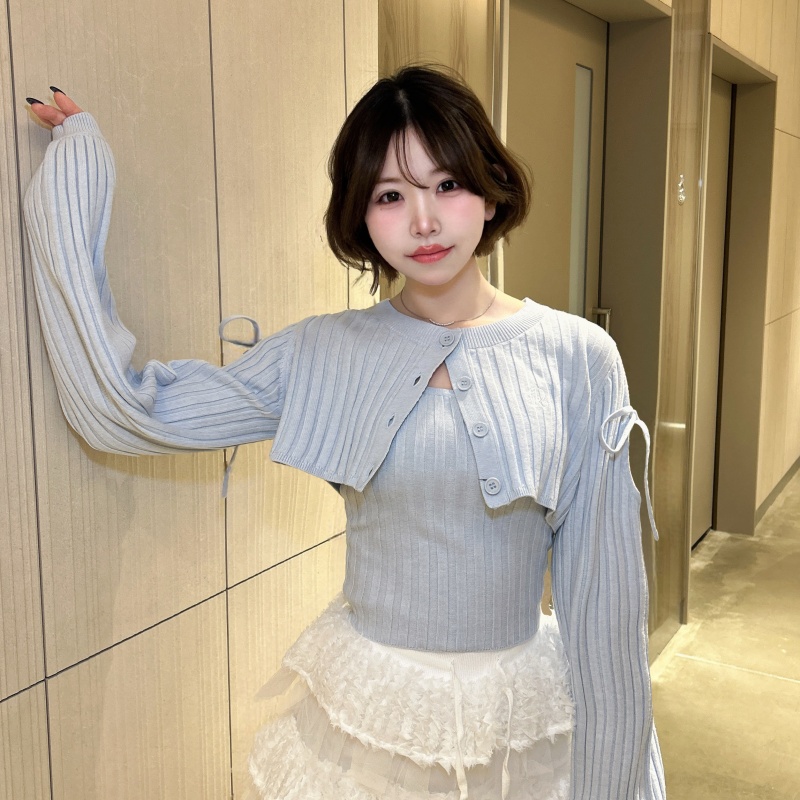 太めリブのキャミ×ショートカーデのセットは、肩スリットとリボンが可愛い旬デザインで着るだけでこなれ感UP✨