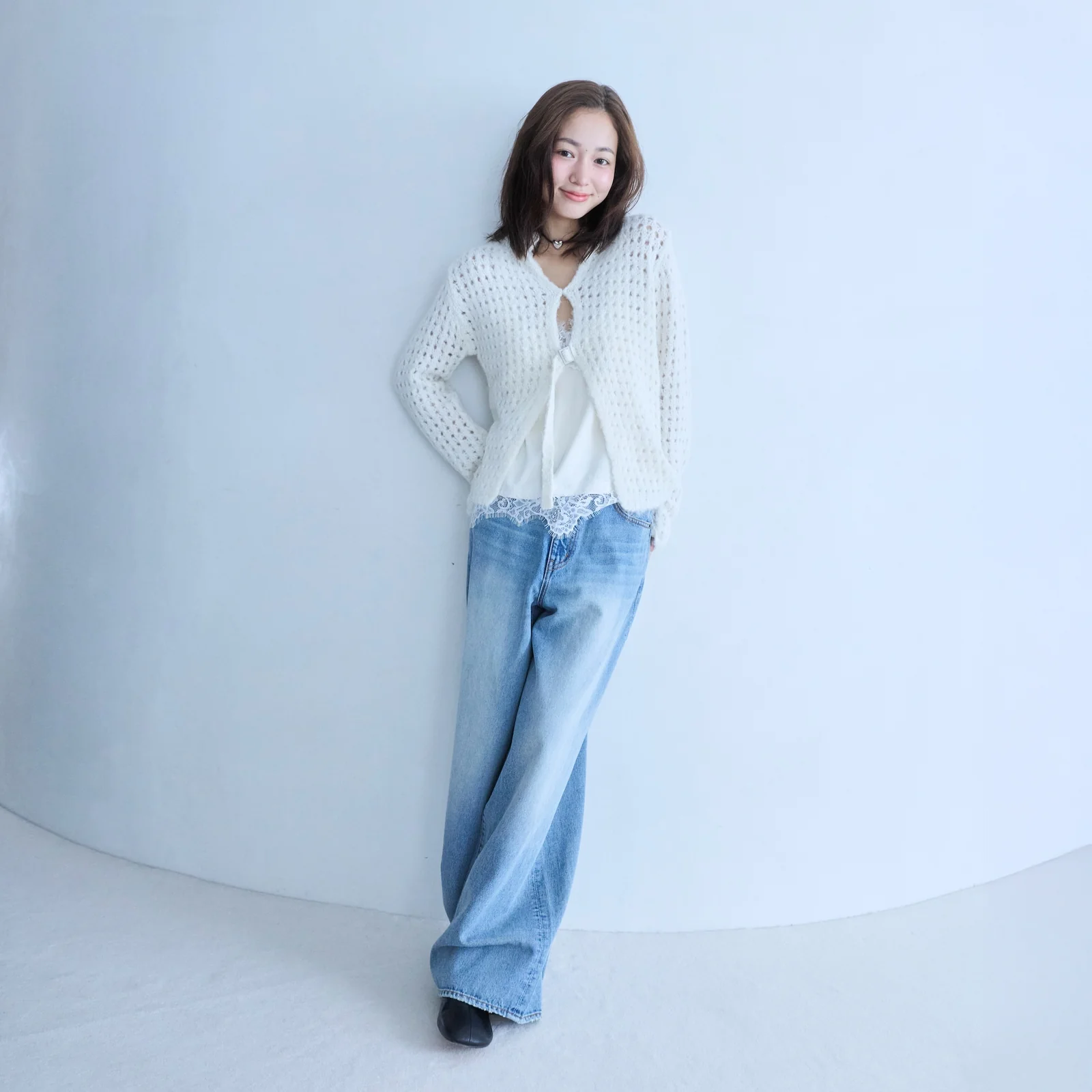 温かみのあるウール混の糸を採用。毛足のあるふんわりとした糸と柔らかなタッチが特徴の1枚。メッシュ編みにすることで、程よい抜け感と立体的な風合いが生まれ、軽やかな着心地に仕上がりました。