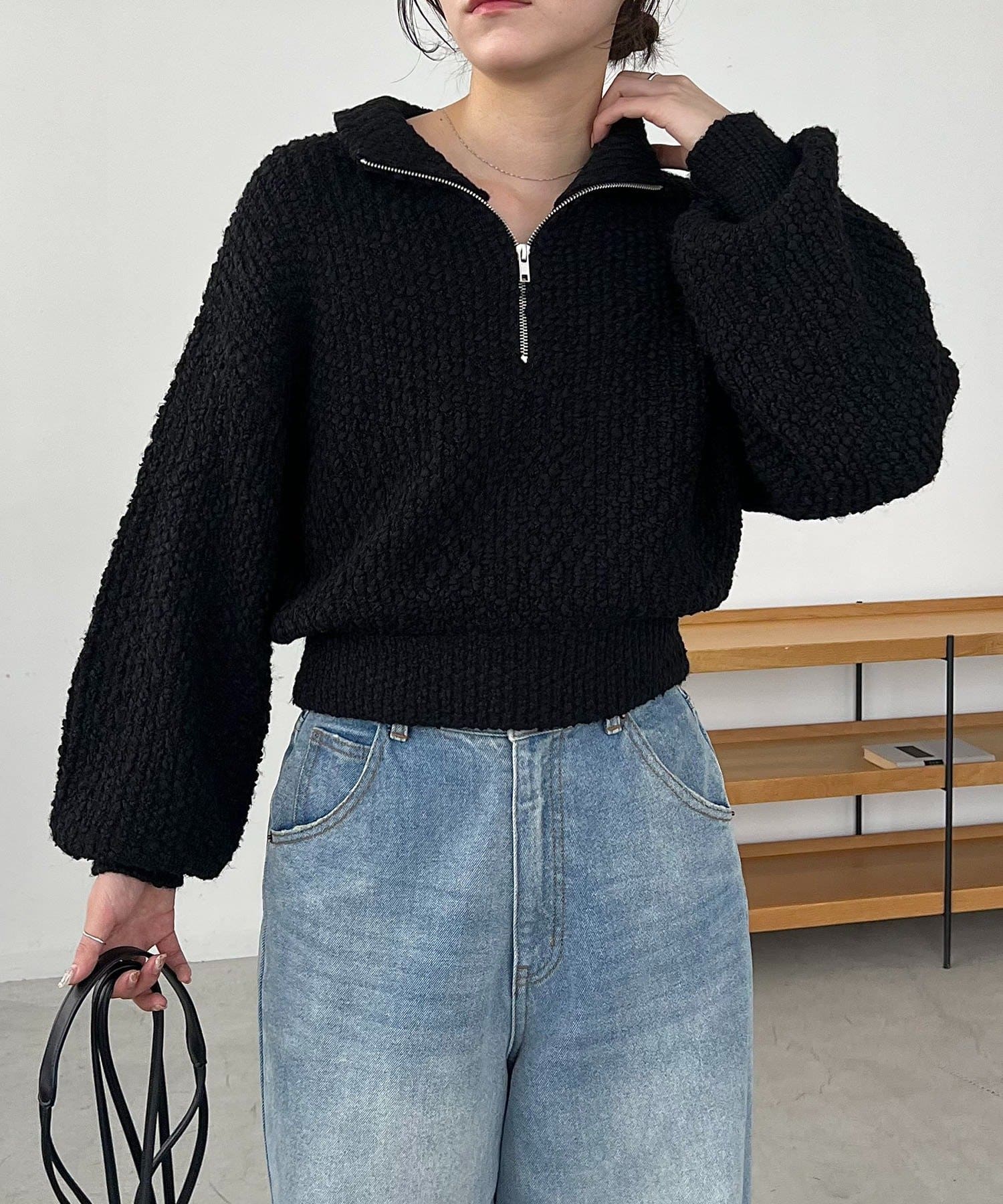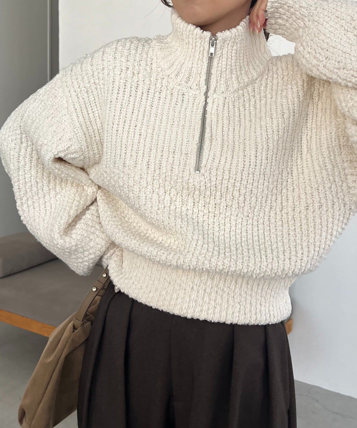 ハーフジップになっているので開けてすっきり、閉めて暖かく着ていただけます✔️