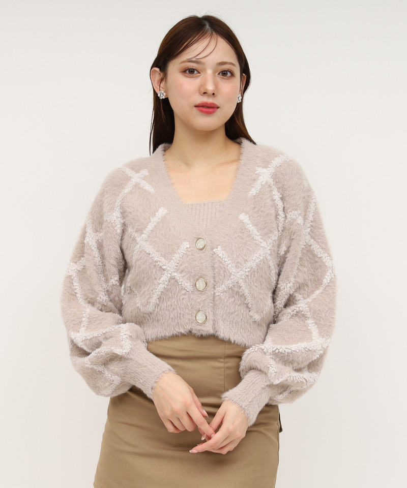 ふんわりとした肌触りの冬ムード漂うシャギーVネックカーディガン×キャミソールのアンサンブル。
