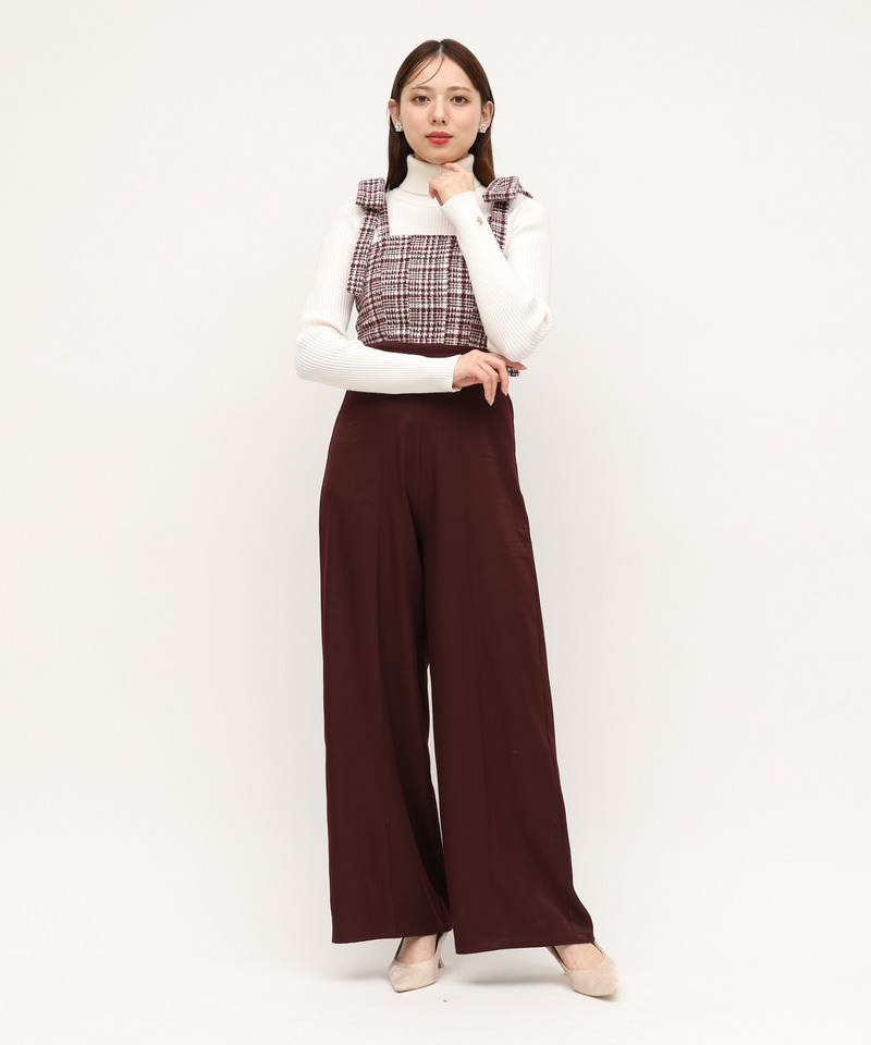 ショルダーリボンチェックワイドオールインワン
