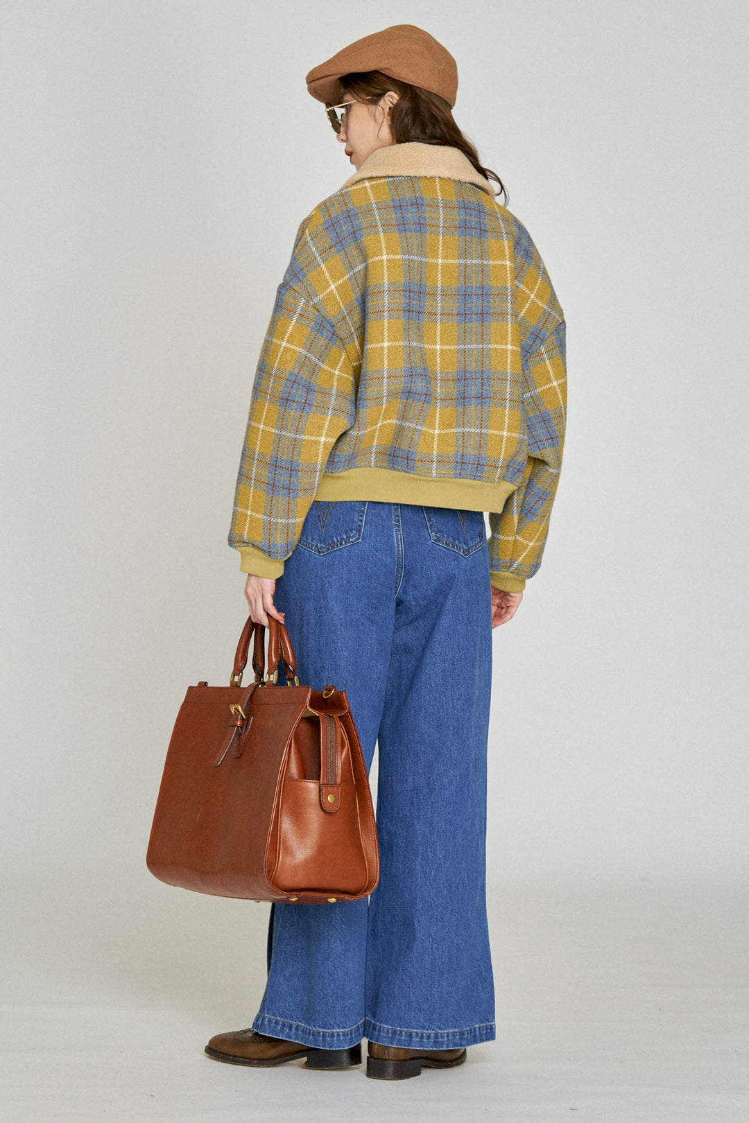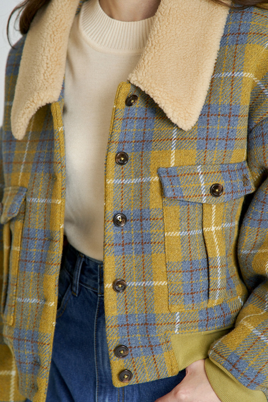 柔らかな色味のチェックがかわいいボアカラーのジャケットアウターです🐑