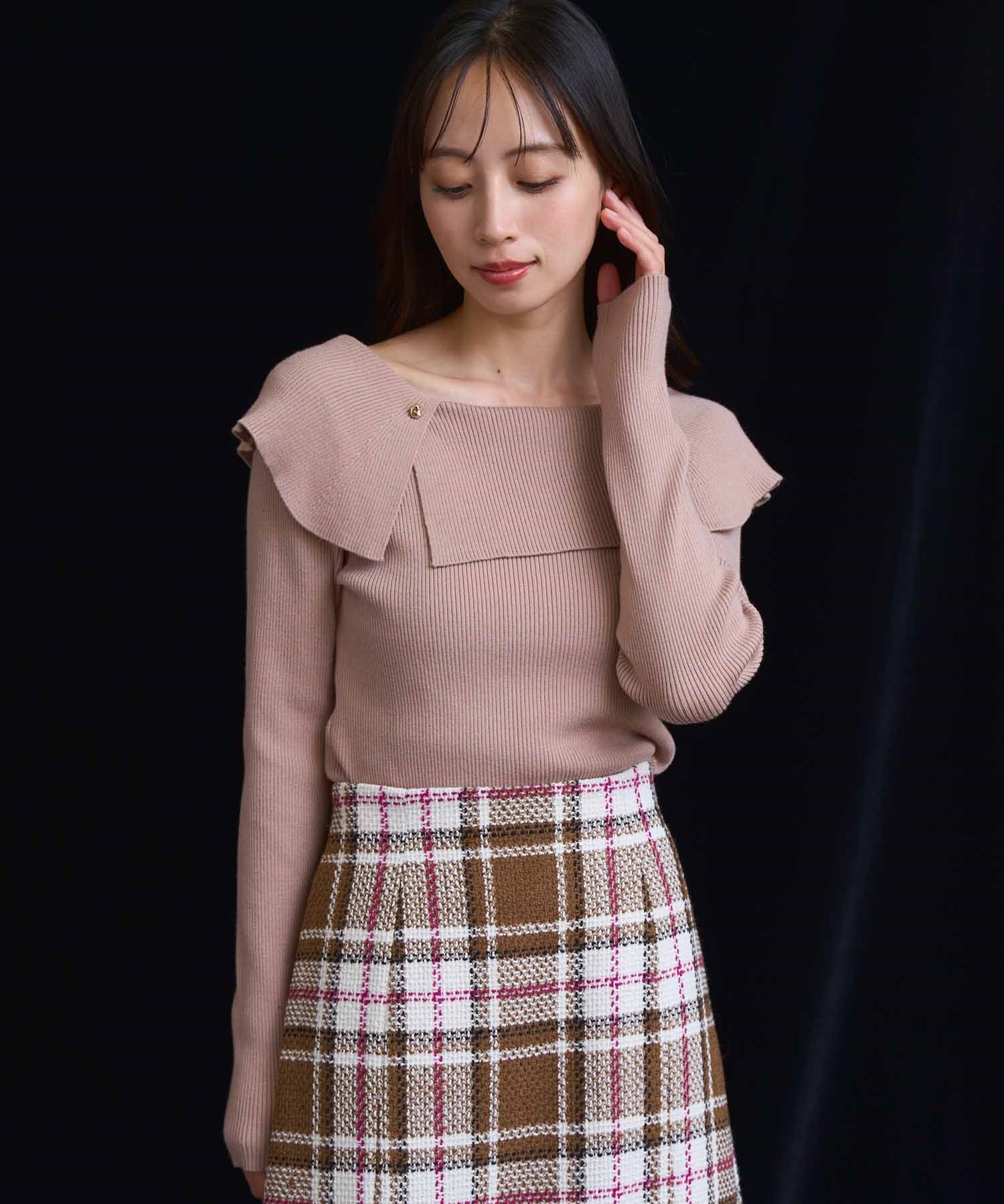 チェック柄のマーメイドスカートと合わせれば、女性らしさを引き立てる上品なスタイリングが完成します。