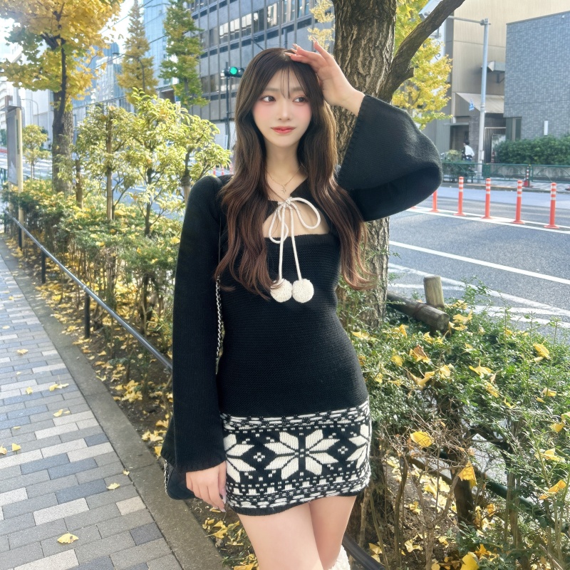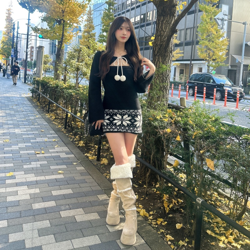 ノルディック柄×配色ポンポンリボンが一目で可愛い、冬ムードたっぷりのミニワンピース♡❄️