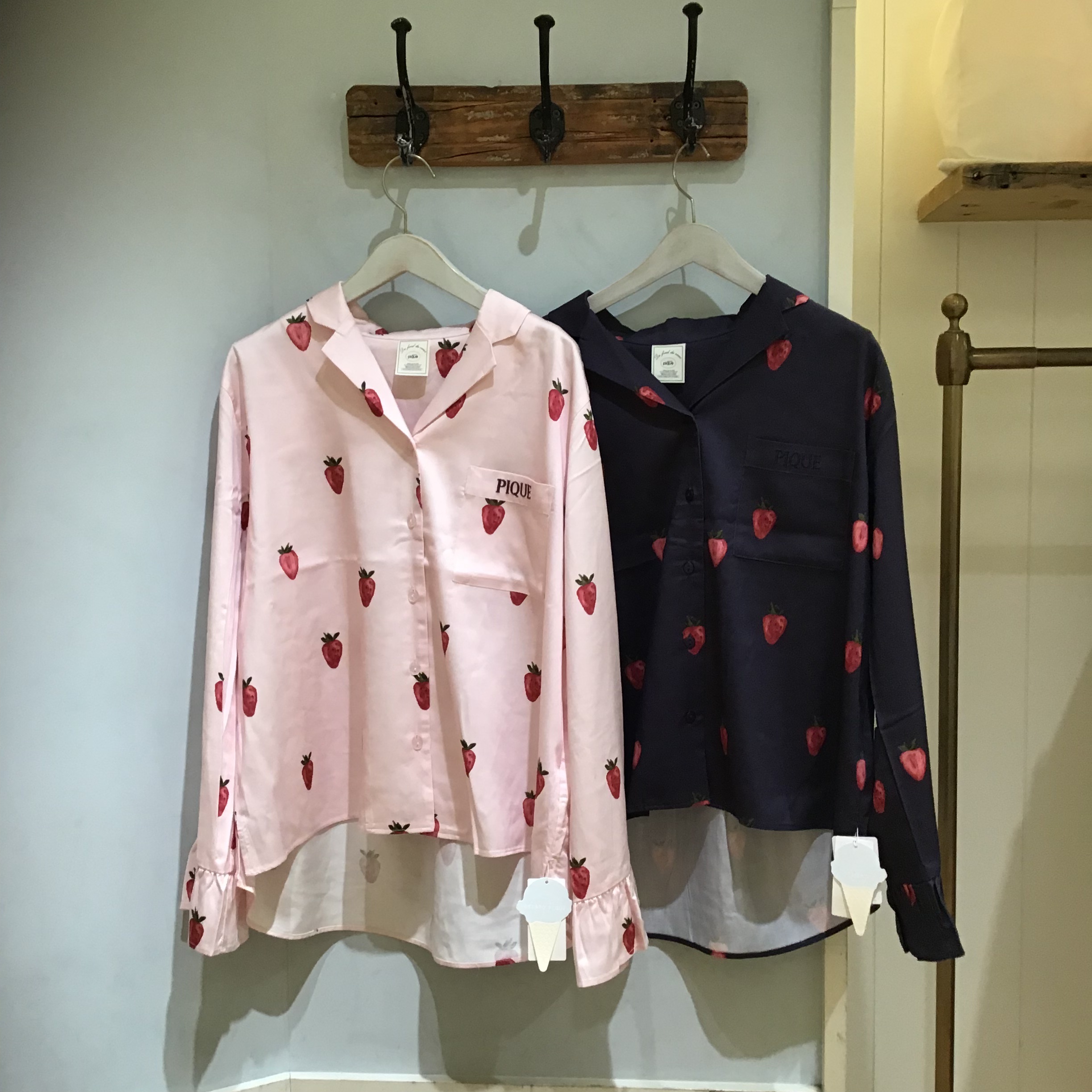 じゅわっとした果肉感をリアルに描いたストロベリー柄で、大人っぽいムードに仕上げたツイルシャツ。裾に前後差をつけた抜け感のあるフェミニンなシルエットです🎶胸ポケットにはPIQUEのロゴ刺繍をあしらいました。カラーは大人の女性に似合う優しいピンクと落ち着いたネイビーの2色展開💙同シリーズのロングパンツや小物と合わせて、大人かわいいコーディネートをお楽しみいただけます🎀