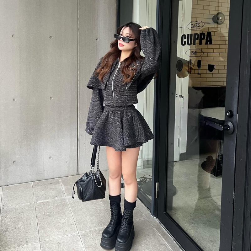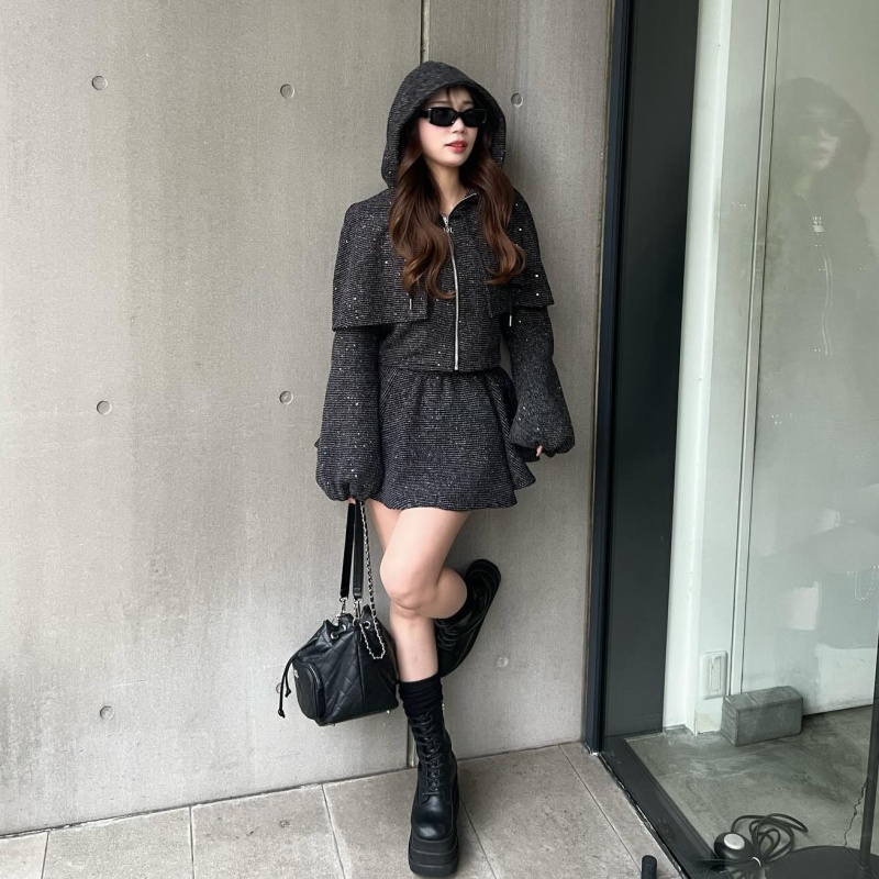 ケープ×フードの唯一無二トップスと、美脚見えが叶うサイドアップミニスカートで、あざとくドラマティックな印象に🫶