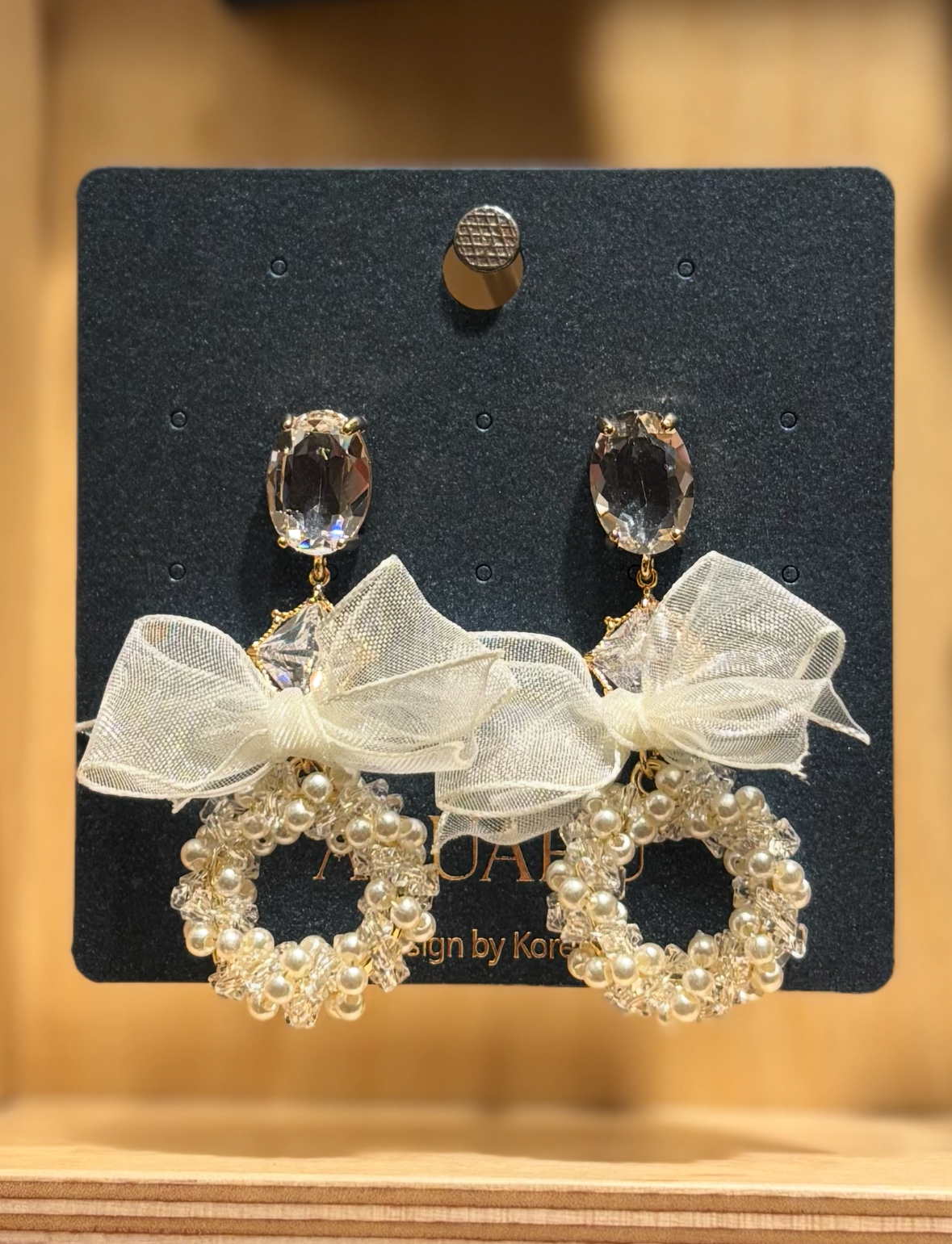 透明感のあるリボンと、パールをたっぷりあしらったサークルモチーフが印象的なピアス🎀💎