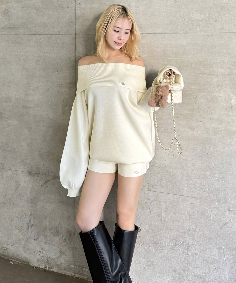 スパンコールラメ糸を織り込んだニット素材が、動くたびにさりげなく上品なきらめきを放つショートパンツ。