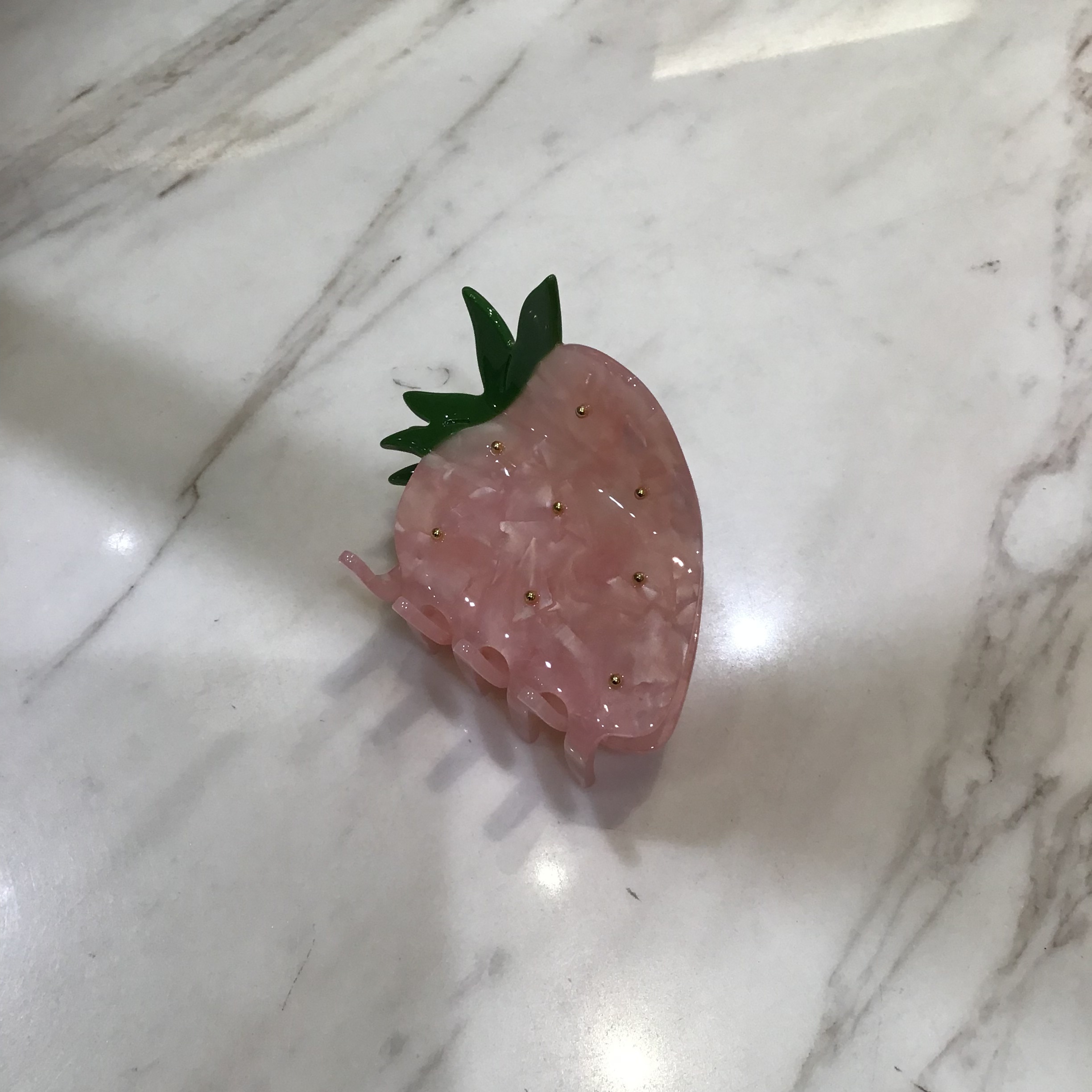 ストロベリーのつぶつぶをゴールドのパーツで表現した、アセチ素材のヘアクリップ🍓ジューシーな質感の生地と、葉っぱの部分までリアルな形にこだわりました🍃ハーフアップにちょうど良い大きさなので、ボブからロングまで幅広いレングスの方にご使用いただけます。同シリーズの小物やルームウェアと組み合わせてお楽しみください✨