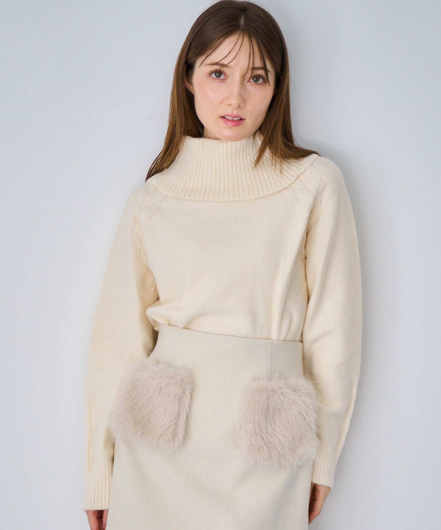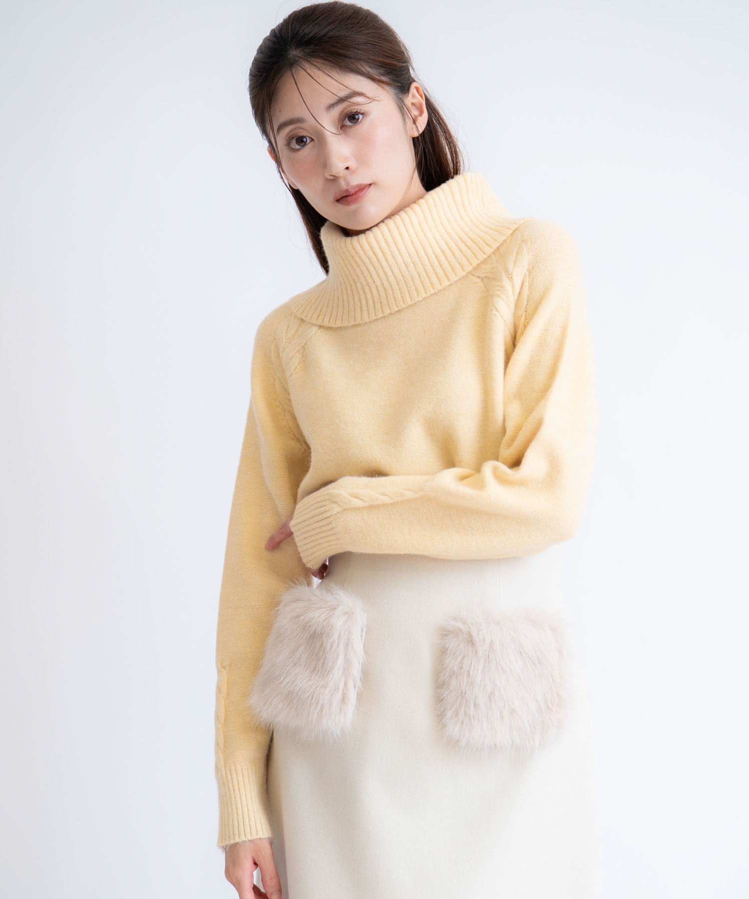 ラグラン部分と袖口にケーブルデザインをあしらったタートルニット。