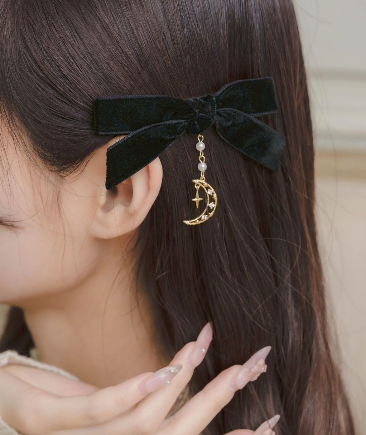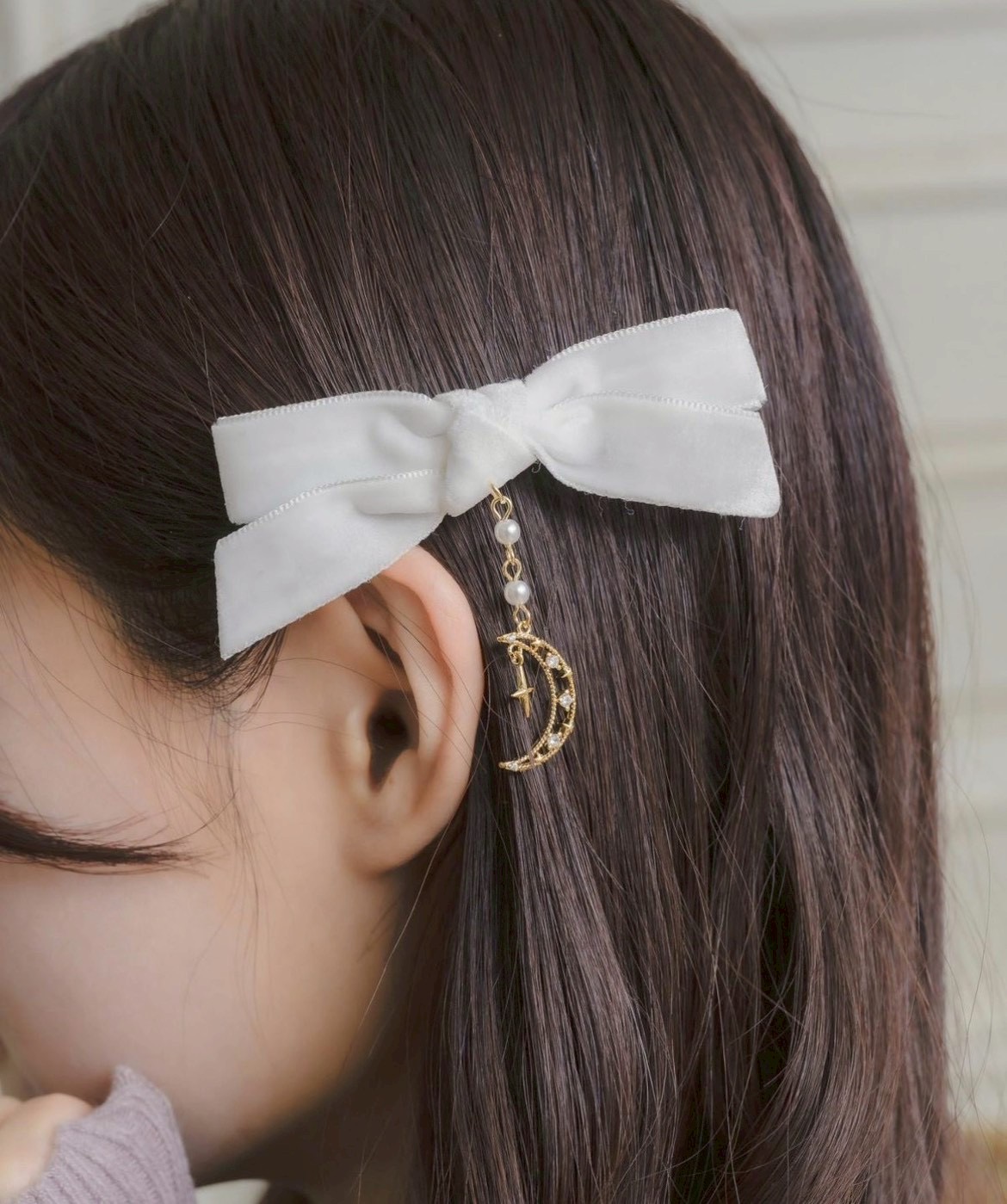上品で可愛らしい印象のベロアリボンクリップセット。シーズンライクなベロア素材が、コーディネートにさりげない季節感を添えてくれます。ファンシーなムーンチェーンがアクセントになり、ヘアスタイルを可愛く仕上げるアイテムです♪