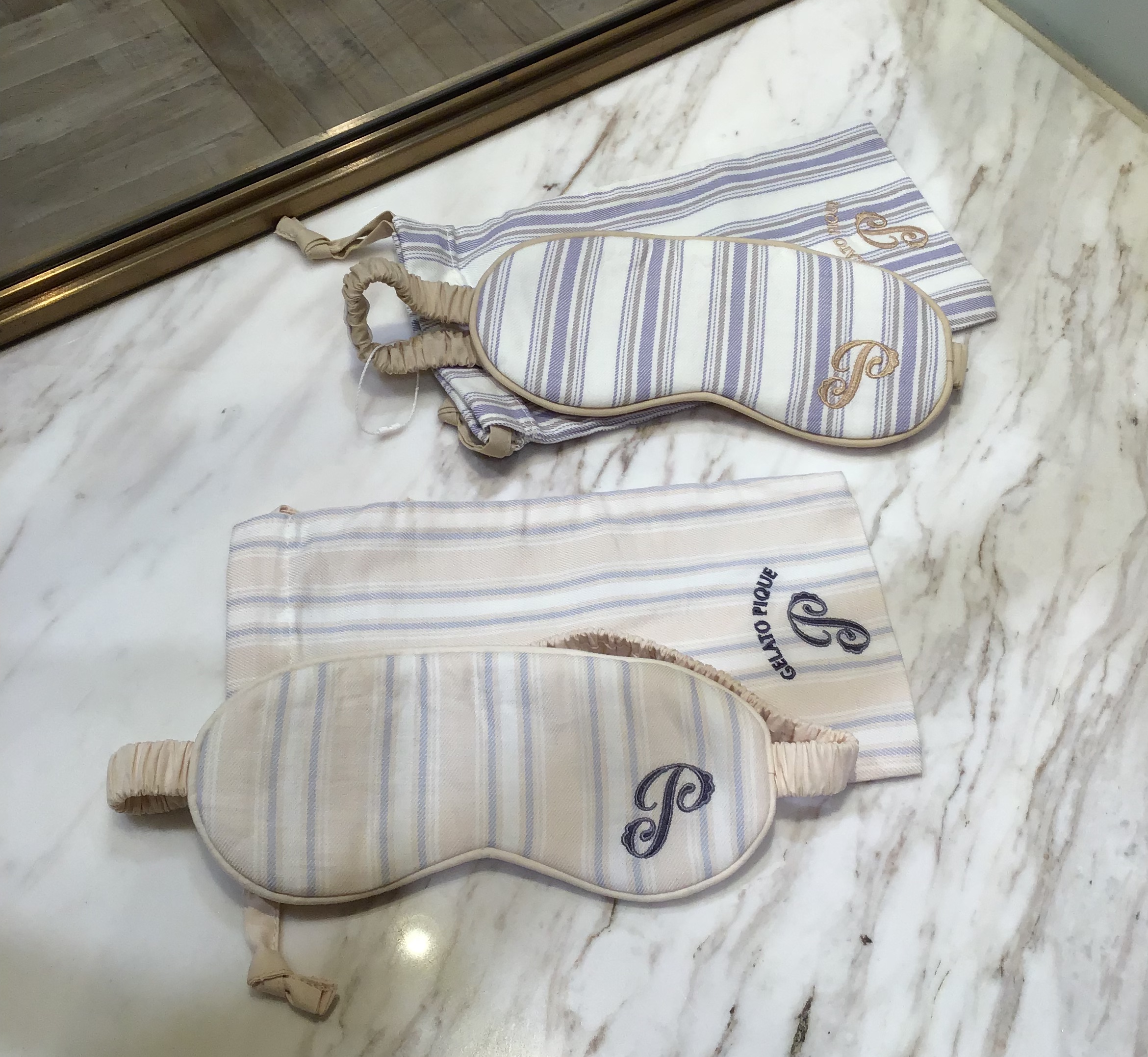 『P』をモチーフにした上品なオリジナルエンブレムが目を引く、ホテルライクな大人のルームウェアシリーズです♩ウェアとお揃いの、柔らかな配色の先染めストライプ生地を使用したアイマスク👀💤それぞれ色違いのエンブレムロゴ刺繍を入れ、配色パイピングで丁寧に仕上げました。機内など旅先でもおしゃれに見えるデザインです。色は飽きのこないブルーとベージュの2色展開✈️✨