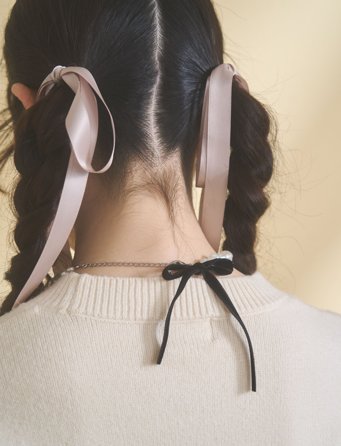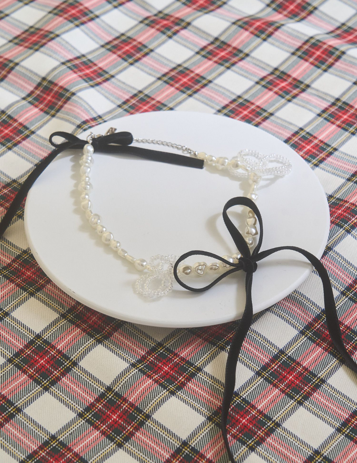 ベロアリボンにやわらかな光をまとったパールとクリアビーズを添えて、