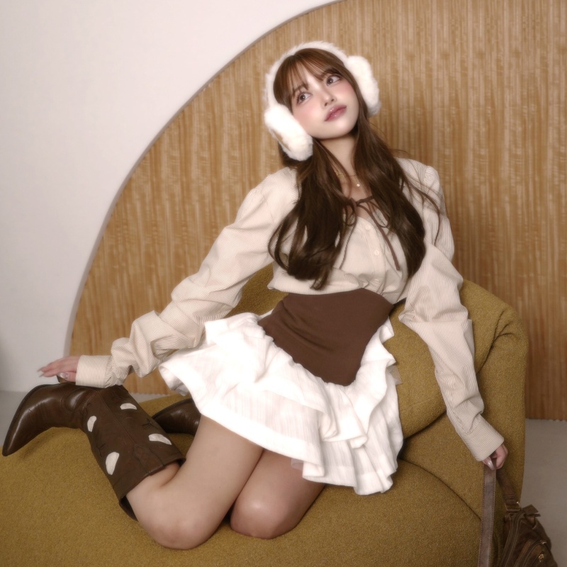 デコルテがきれいに見えるシャツと、フリルたっぷりのミニスカートでクラシカル×ガーリーな美シルエットが完成🎀