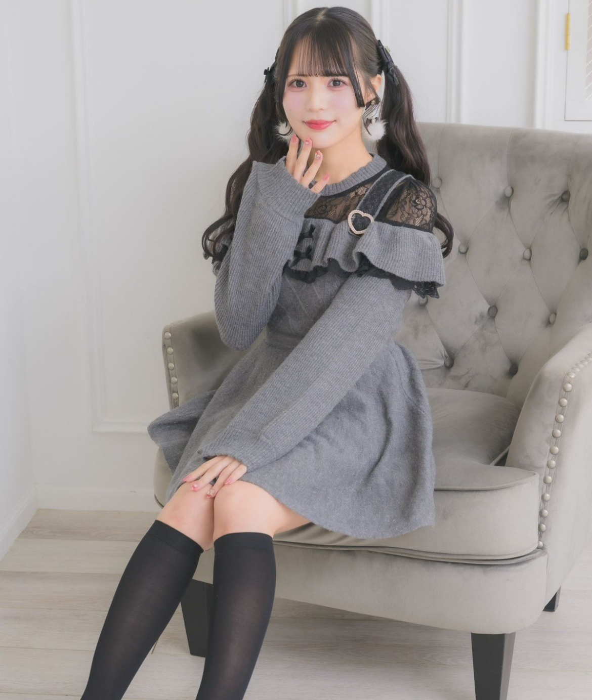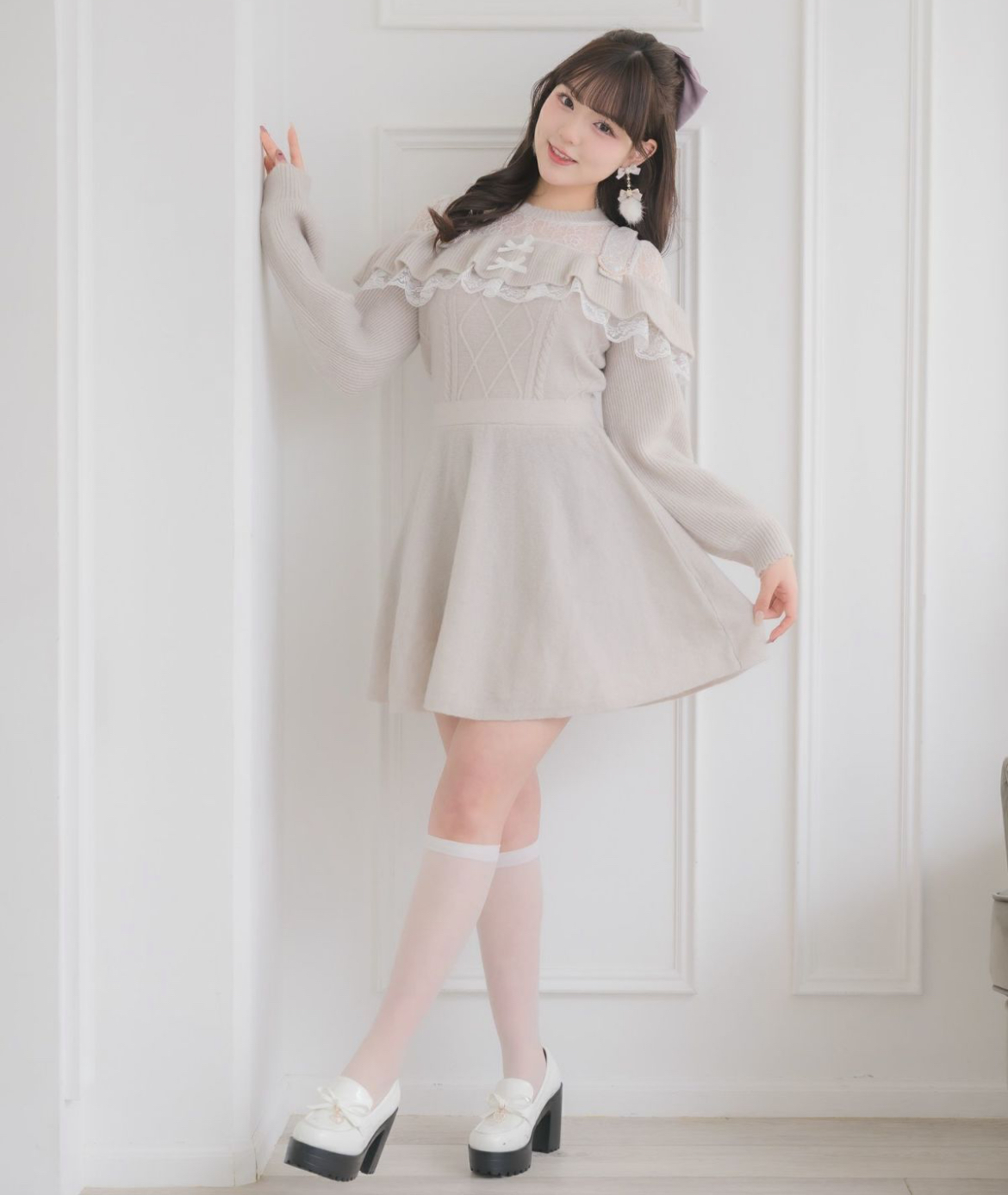 オフショル風のデザインに、レースをあしらった肩紐が周りとの差をつけるニットワンピース♡上品なラメ感で華やかさを演出。ケーブル編みが冬らしいムードを高めてくれます。ペチコート付きでふんわり感もキープできる、女の子らしさ満点の一枚♪