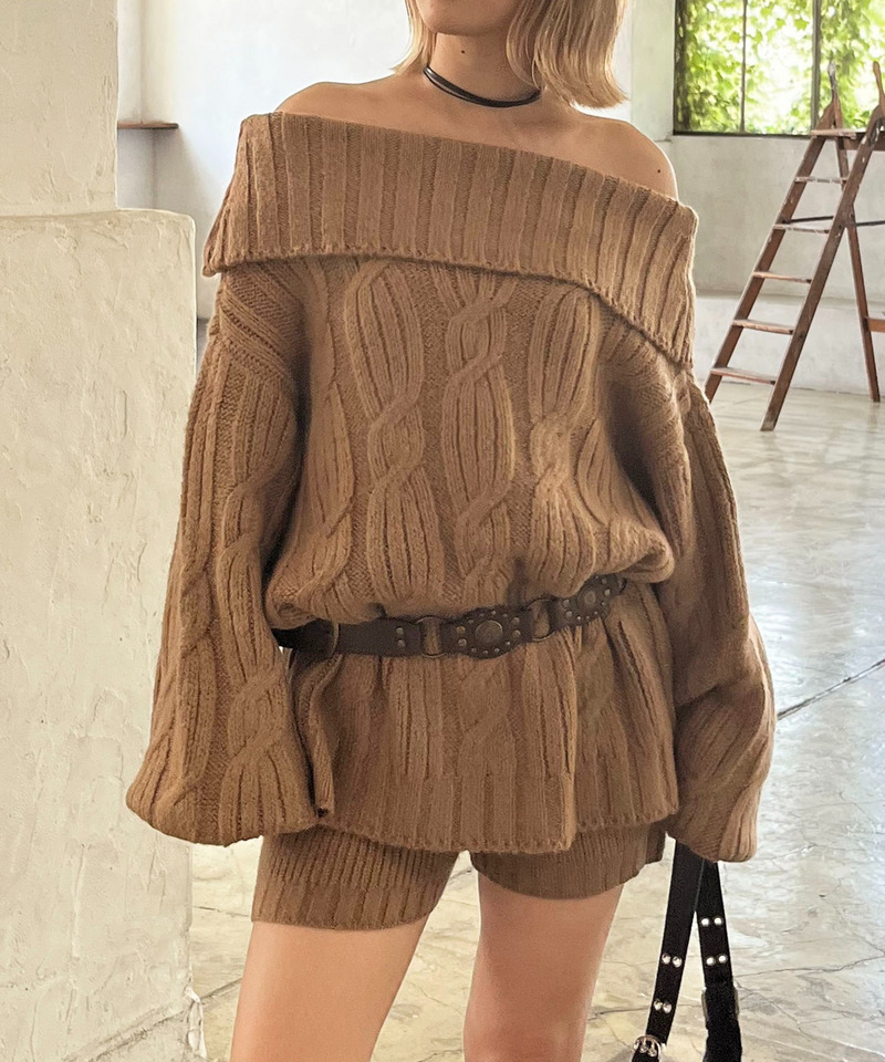 オフショルダーの大きめ襟が女性らしいアクセントに。