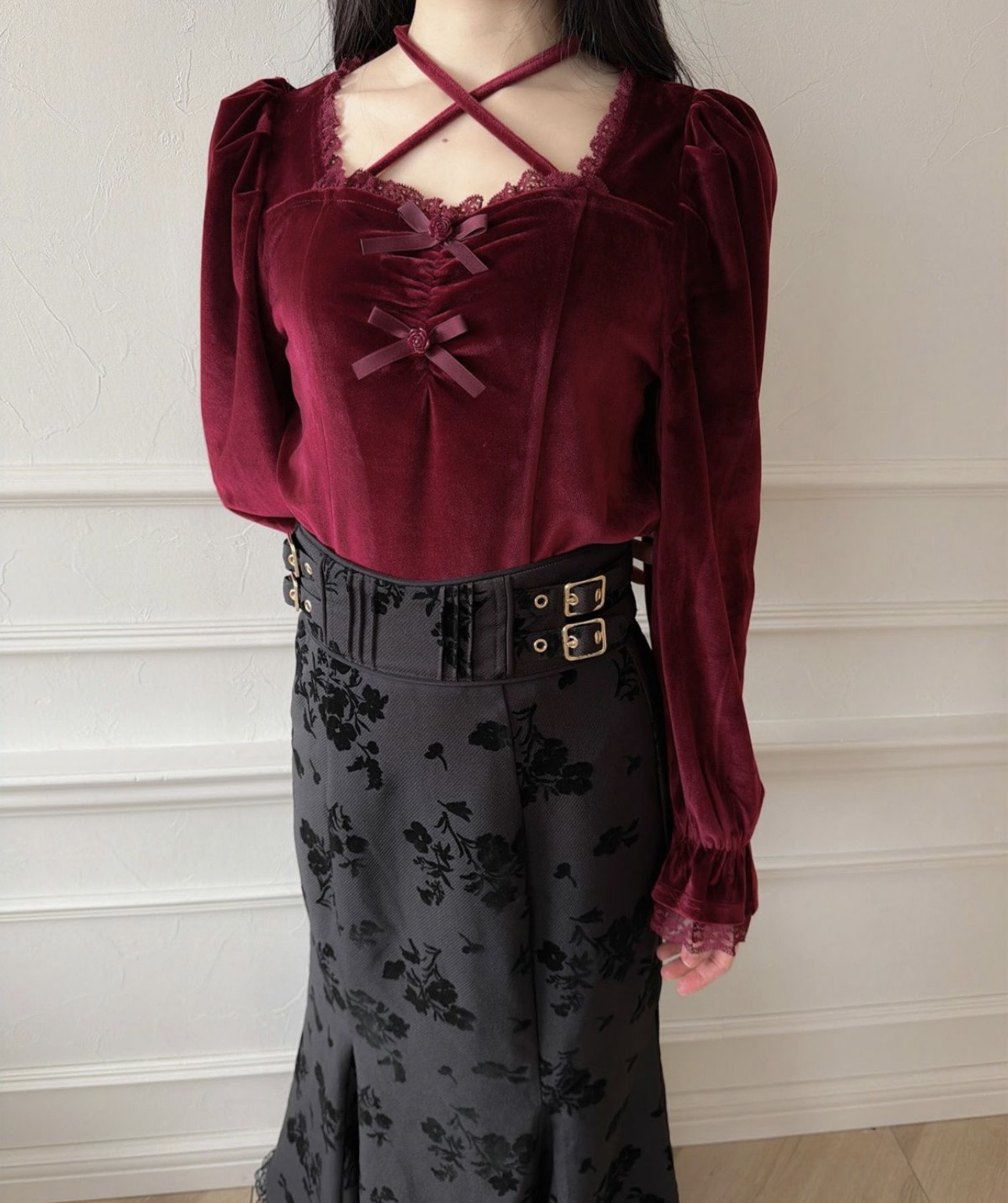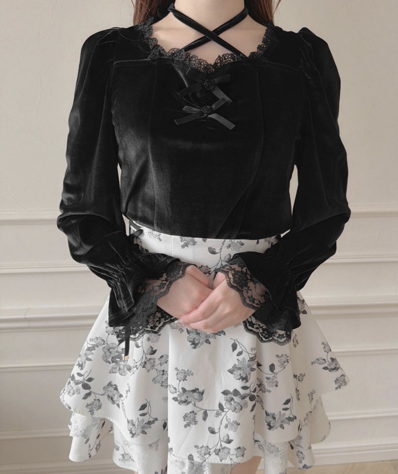 上品な光沢感のあるベロア素材が魅力の、シンプルなワンカラートップス。胸元の切り替えデザインがさりげなくレディな雰囲気を演出します。ローズ釦がポイントになり、デコルテを華奢見えさせてくれるのも◎主張しすぎないデザインなので、幅広いコーデに取り入れやすい一枚です。