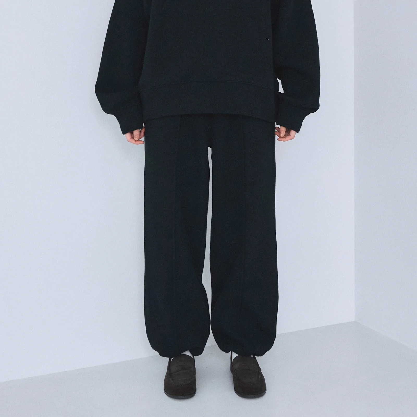 メッシュ編みのスウェット素材を用いた大人のためのイージーパンツ。2WAYシルエットと、縦のラインを意識したピンタックで、リラックスしながらも端正な印象を与えます。