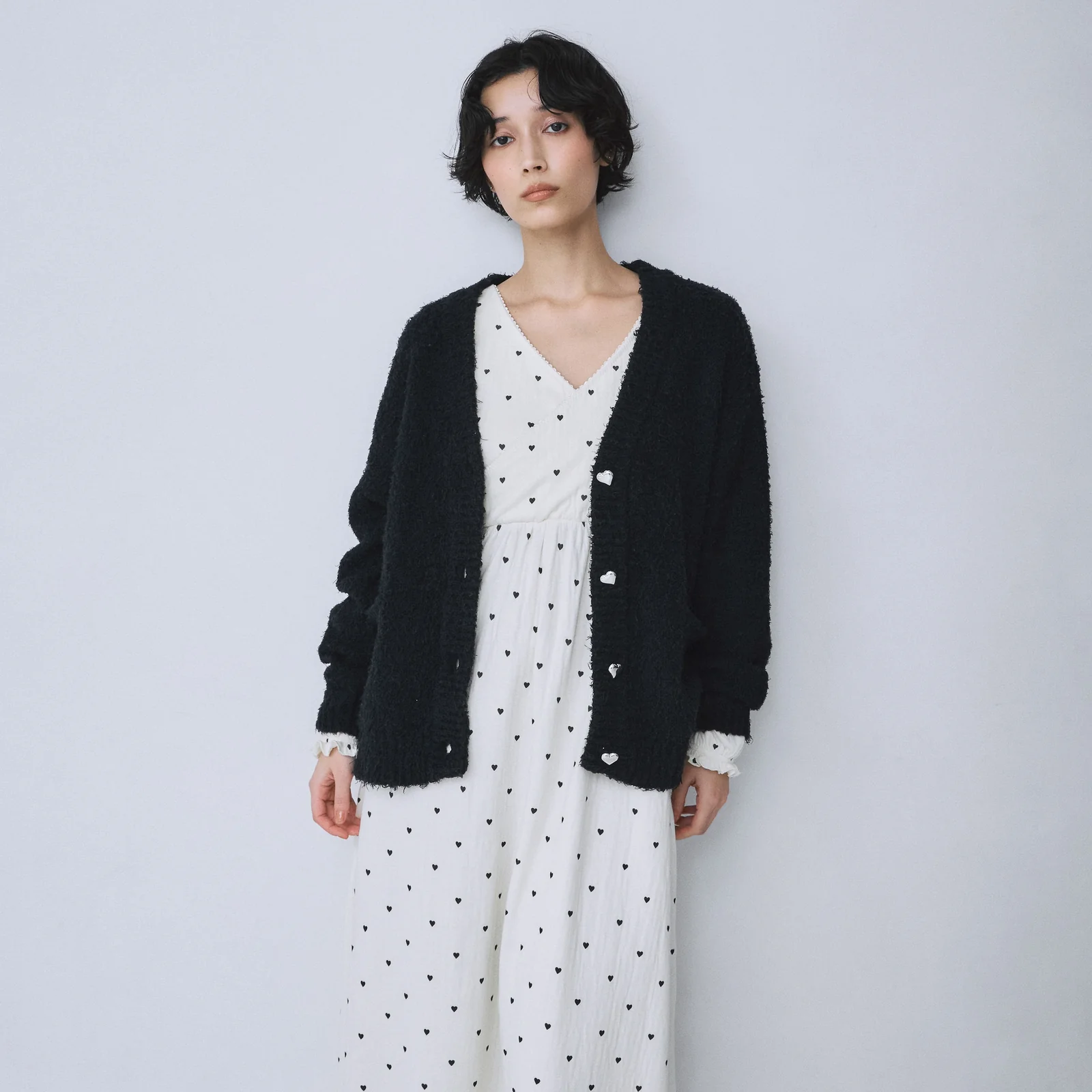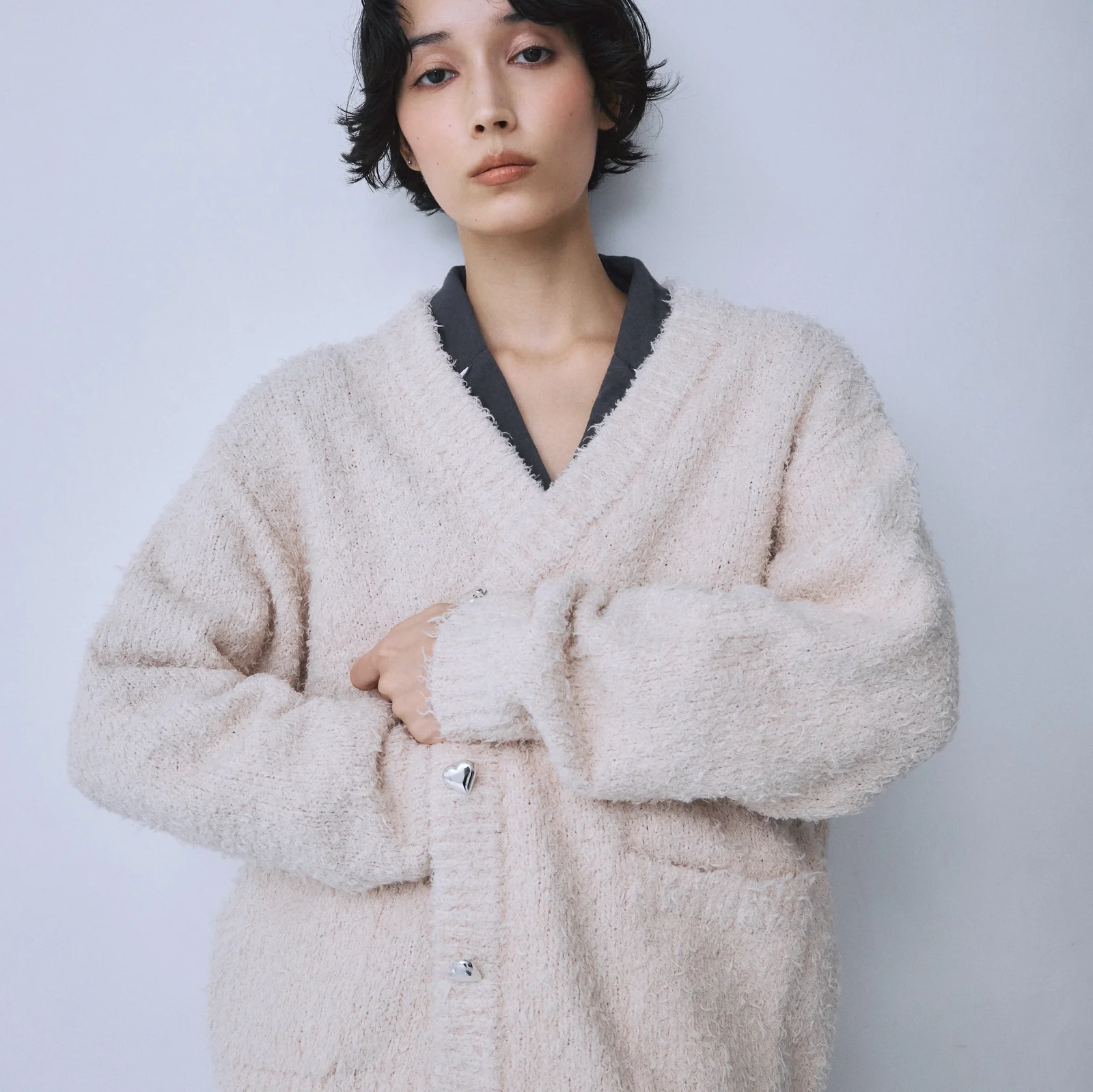 “Cozy(コージー)”という名前のとおり、体を包み込むリラックス感が魅力のニットカーディガン。ところどころに毛足の表情を持たせた優しい風合いが魅力で、軽さと温かさを両立。リラックスシルエットと深すぎないVネック、シルバーのハートボタンがチャームポイントに。