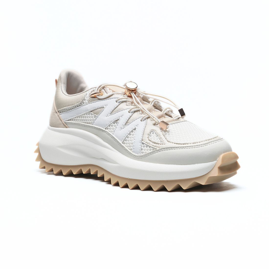 上品なニュアンスカラーとホワイトを基調とした配色に加え、センターに配置されたアクセントが、モダンで女性らしい印象をプラスしています。アクティブでおしゃれな女性にぴったりの一足です