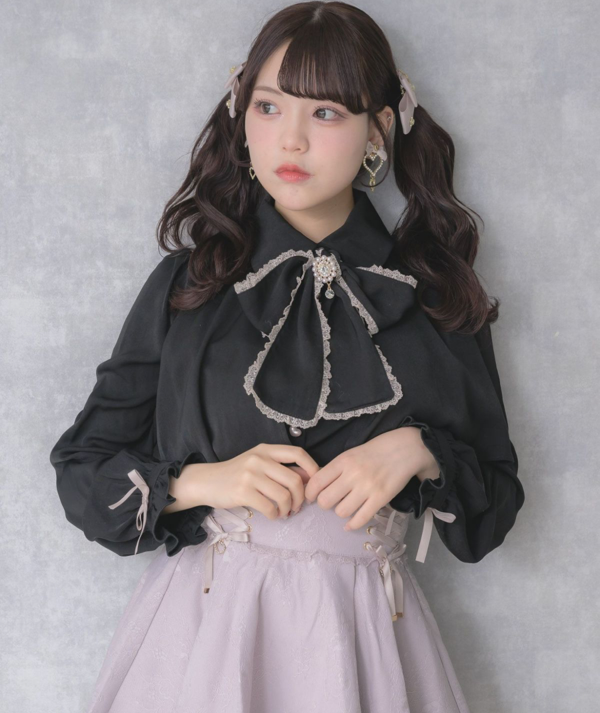 季節感アップ♡人気デザインが長袖になって再登場!首元のボウタイリボンが華やかさと可愛らしさをプラス。フレア感のあるケープデザインや艶めくハート釦で、とことん女の子らしい雰囲気に。レース配色がアクセントになった、一枚で華やぐブラウスです。
