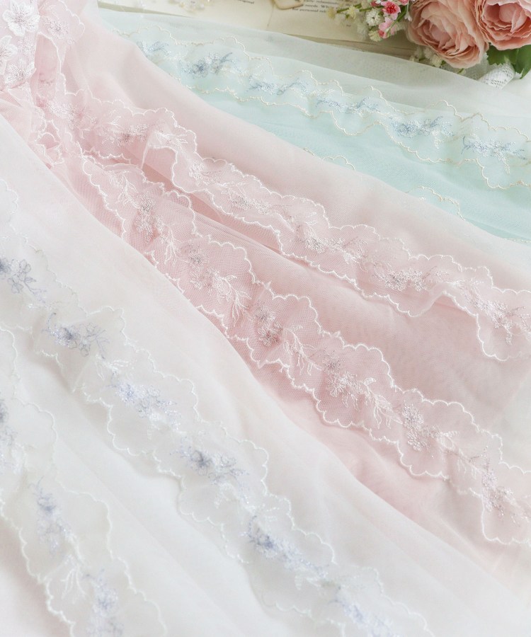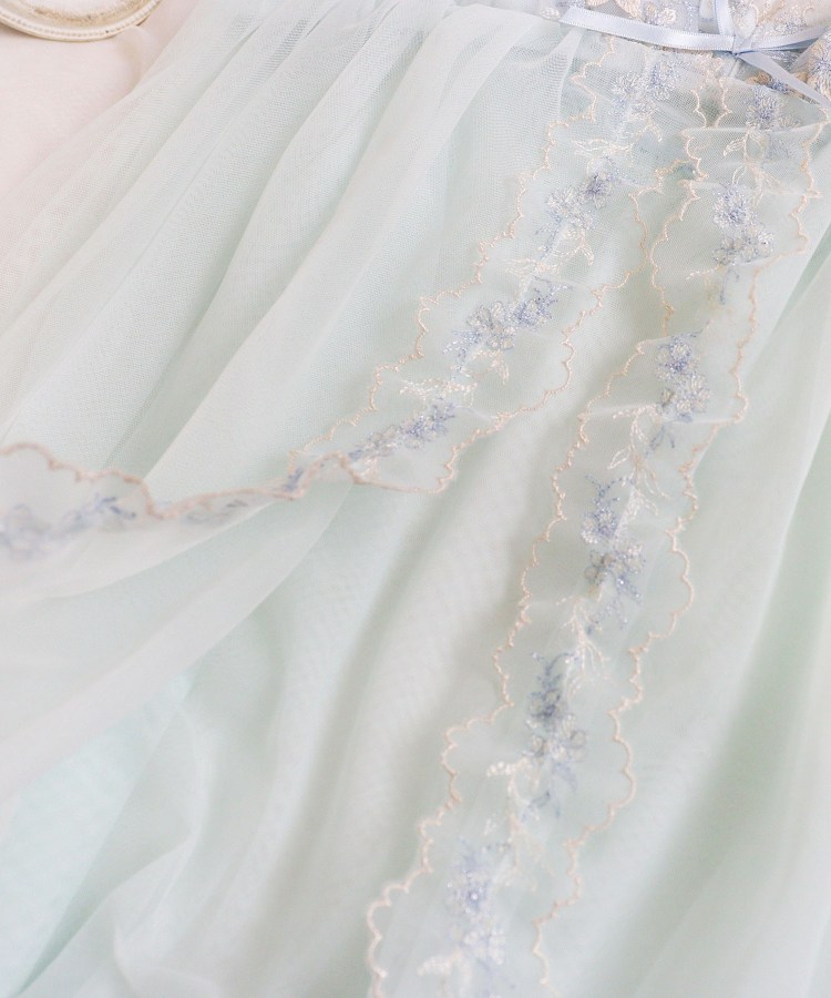 クレマチスの可憐な花々をモチーフに、小花や茎などを繊細なラメ糸で表現したシリーズです。パッカー手法でふっくらと咲かせた大輪のクレマチスは、キラキラとしたラメ糸をあしらい、動くたびにさりげなくきらめく上品なデザインに仕上がりました。身生地は透け感を楽しめるソフトチュール素材で、長さの異なるチュールを2枚重ねることで、女の子らしいフレアシルエットが完成。縦にあしらわれたギャザーたっぷりのチュールレースは、軽やかでキュートな印象をプラスします。毎日を特別な気分にしてくれるような、清楚で可愛らしいコレクションです。