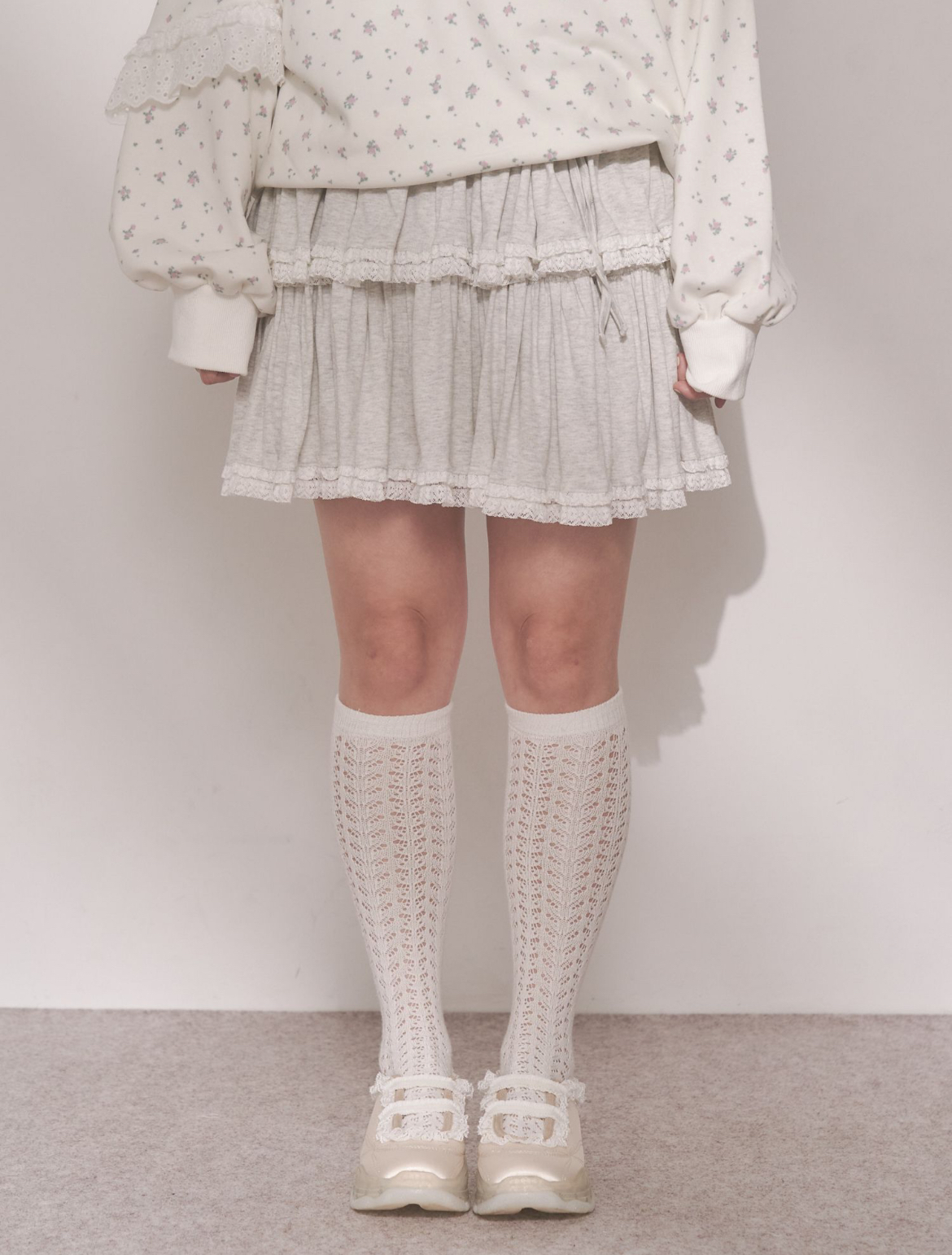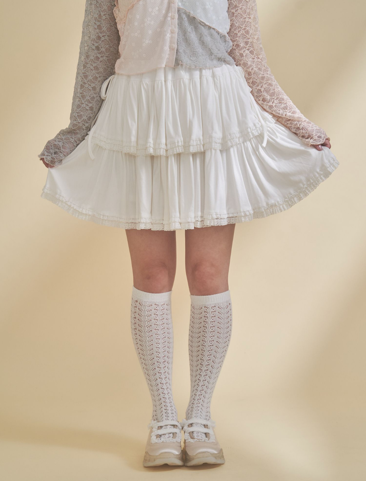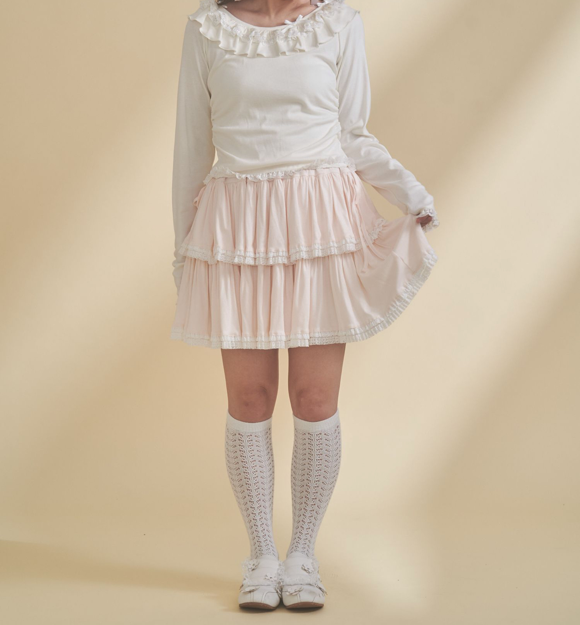 裾にあしらったフリルテープが、動くたびにふわりと揺れて軽やかな表情を見せてくれます。