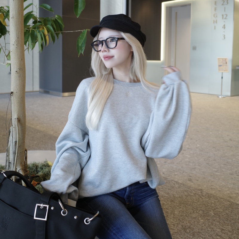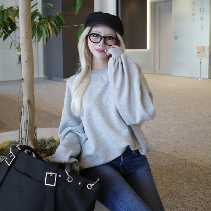 丸みのあるボリュームスリーブと立体的なシルエットで、カジュアルながら女性らしさを引き立てるスウェットトップス♡ 袖口と裾のリブが程よくフィットし、ラメ混素材と刺繍ロゴがさりげない特別感をプラス✨