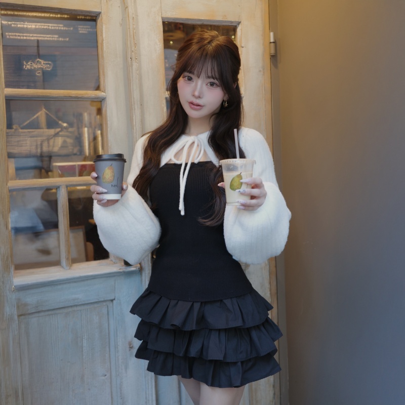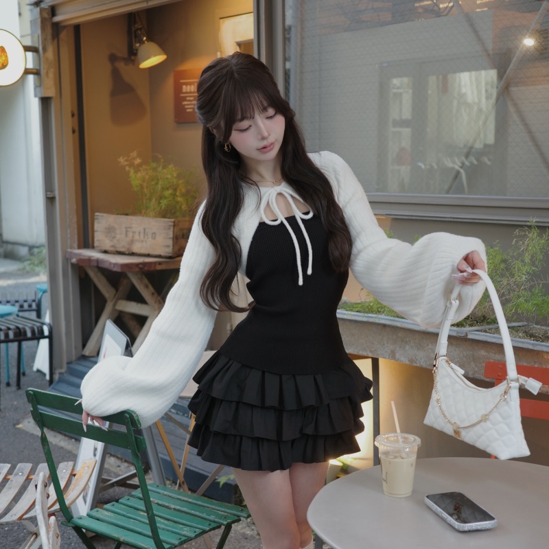 3段フリルが可愛いキャミソールミニワンピースと、ふんわりボレロのセットで、肩紐を外せばベアワンピとしても着られる2WAY仕様🎀